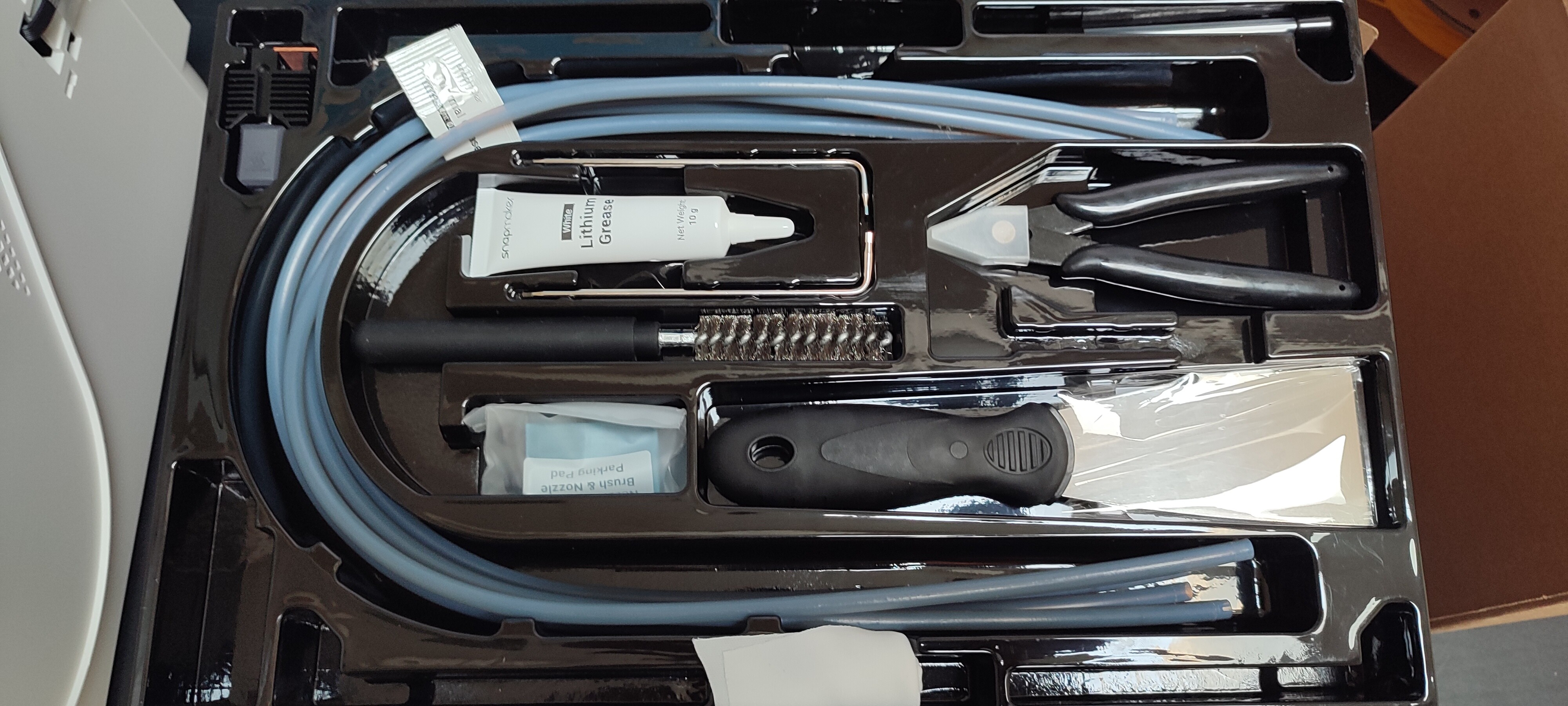 В комплекте дополнительно идут запасной хотэнд, скребок, флешка, кусачки, набор ключей, запасные подающие трубки, очень классный ершик для сопел и прочие комплектующие.