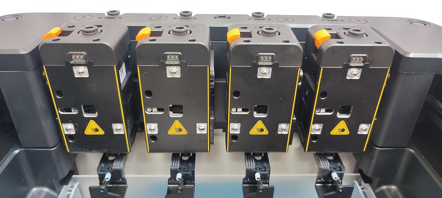 Для сбора отходов от прочистки сопел используется навесной контейнер, устанавливаемый под системой с печатающими блоками. Прочистка сопел выполняется только при заправке материала, перед печатью и при калибровке. Во время печати никаких прочисток не происходит. На фото ниже видны «подушки» для запирания сопел при простое и система очистки сопла после продувки материала. Обозначения R и L обозначают вариант печатающего блока, устанавливаемый в гнездо — левый (одна штука в комплекте) или правый (три штуки).