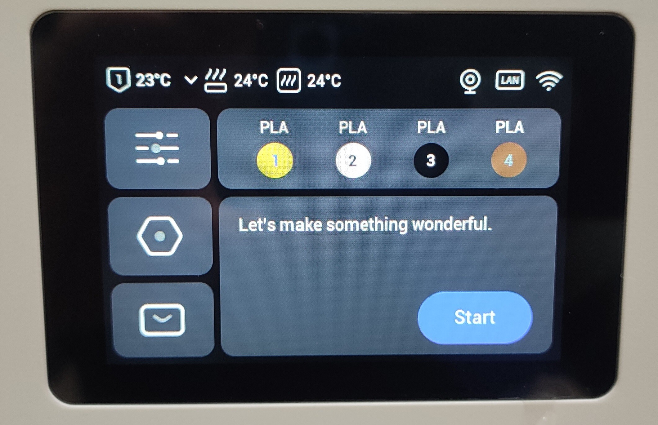 В меню принтера ничего особо нового и сложного нет. Запуск печати с внутреннего накопителя вынесен в отдельный блок с кнопкой Start. При запуске цветной печати можно сопоставить заложенные в G-code цвета и загруженные филаменты.