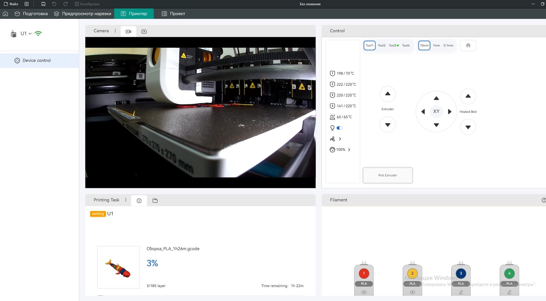 Для печати я использовал только пластики PLA и PETG, так как по факту принтер предназначен для быстрой печати цветной художки и игрушек. Печать технички на Snapmaker U1 без колпака не предусмотрена.