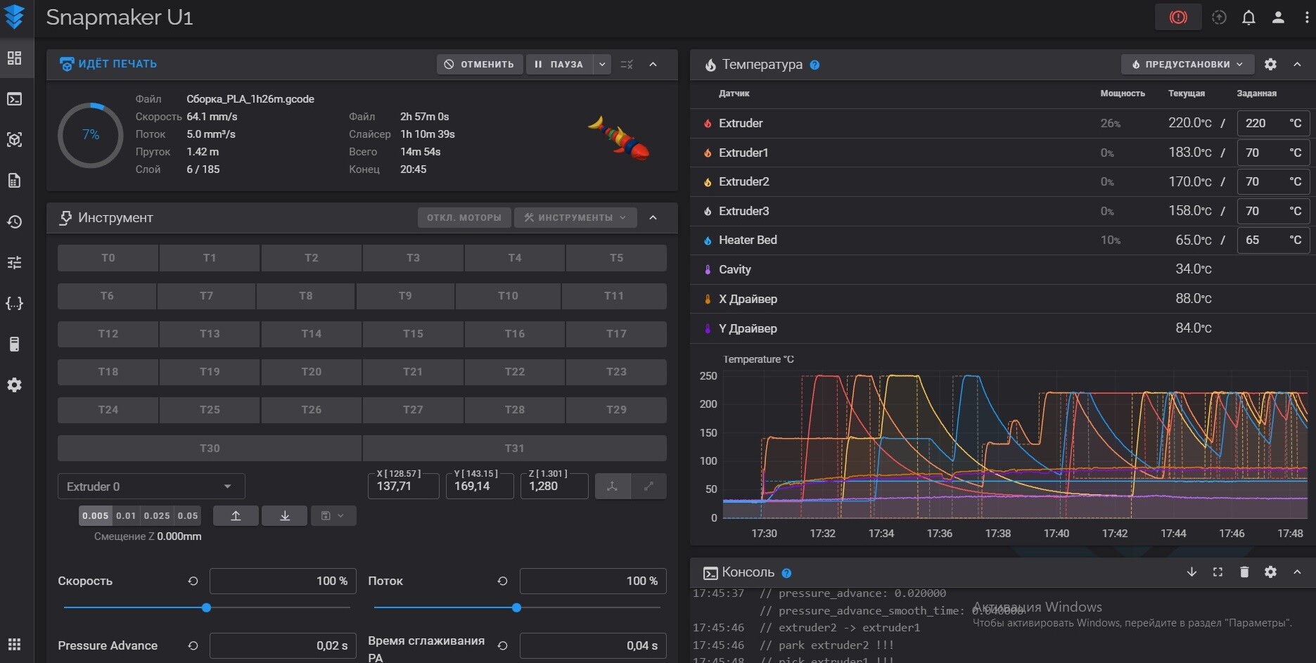 Здесь же видно, что во время печати все используемые хотэнды находятся уже в преднагретом состоянии.