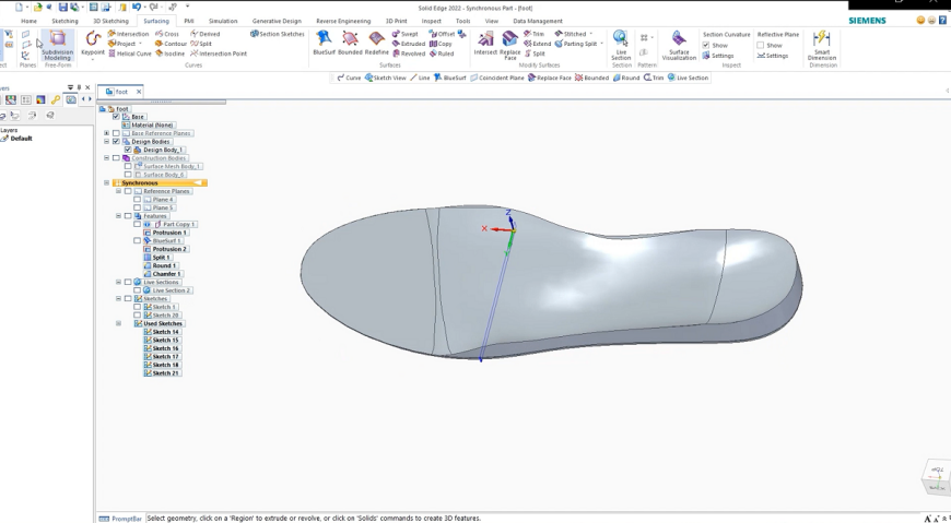 Проектирование начинается с импорта полигональной сетки в Solid Edge. Затем импортируется модель выкройки стельки, и две модели совмещаются, чтобы можно было вычесть форму подошвы стопы из модели будущей стельки. Обводы стельки вычерчиваются инструментом Curve Sketch. Результат преобразуется в твердое тело и экспортируется для последующей 3D-печати.
