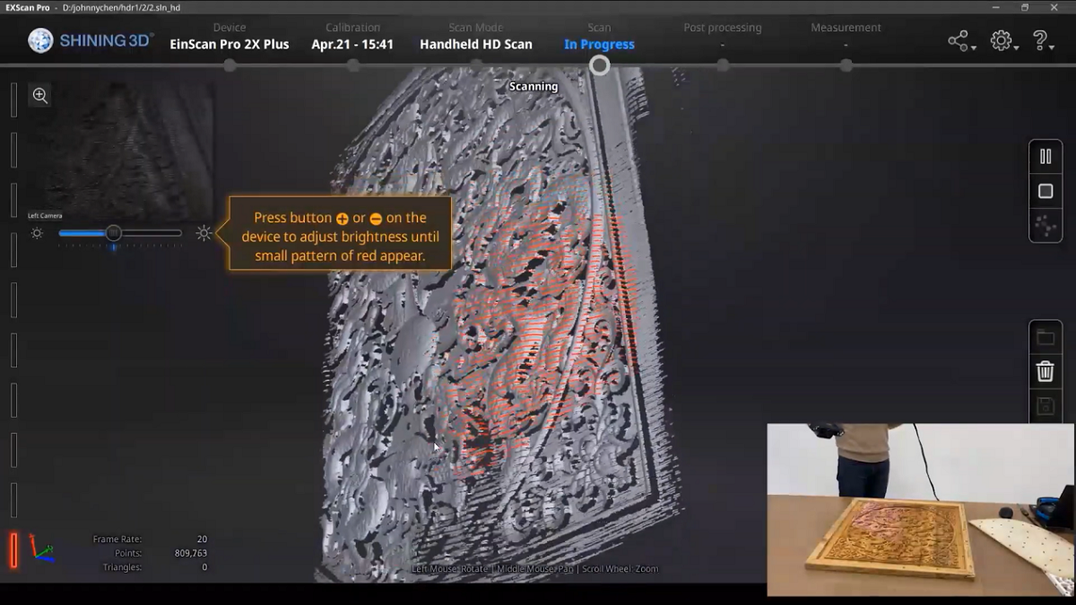1. При ручном 3D-сканировании больших объектов (когда работать в стационарном режиме неудобно) с высокими требованиями к детализации (например, при оцифровке статуи), отдельные участки (например, лицо) можно отсканировать отдельно в режиме высокой детализации.
