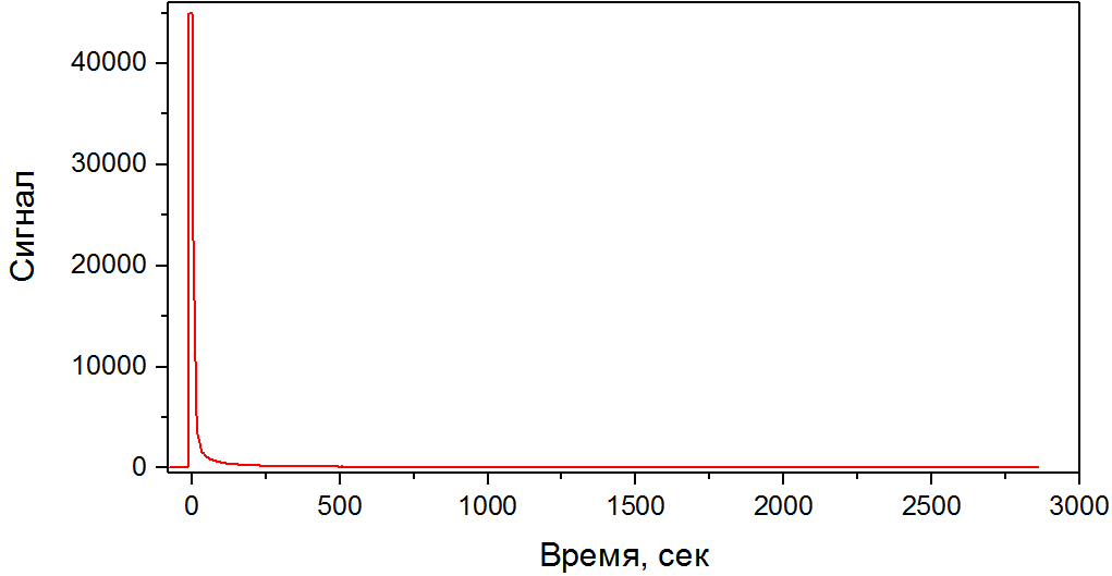 Полочка в начале графика, это уровень, который мы примем за начальный. Далее я в течении примерно 5 секунд осветил образец лазером (на графике это полка в максимальных значениях, детектор засветился и фиксировал максимальные значения). Затем фиксировалось излучение по схеме, описанной выше.