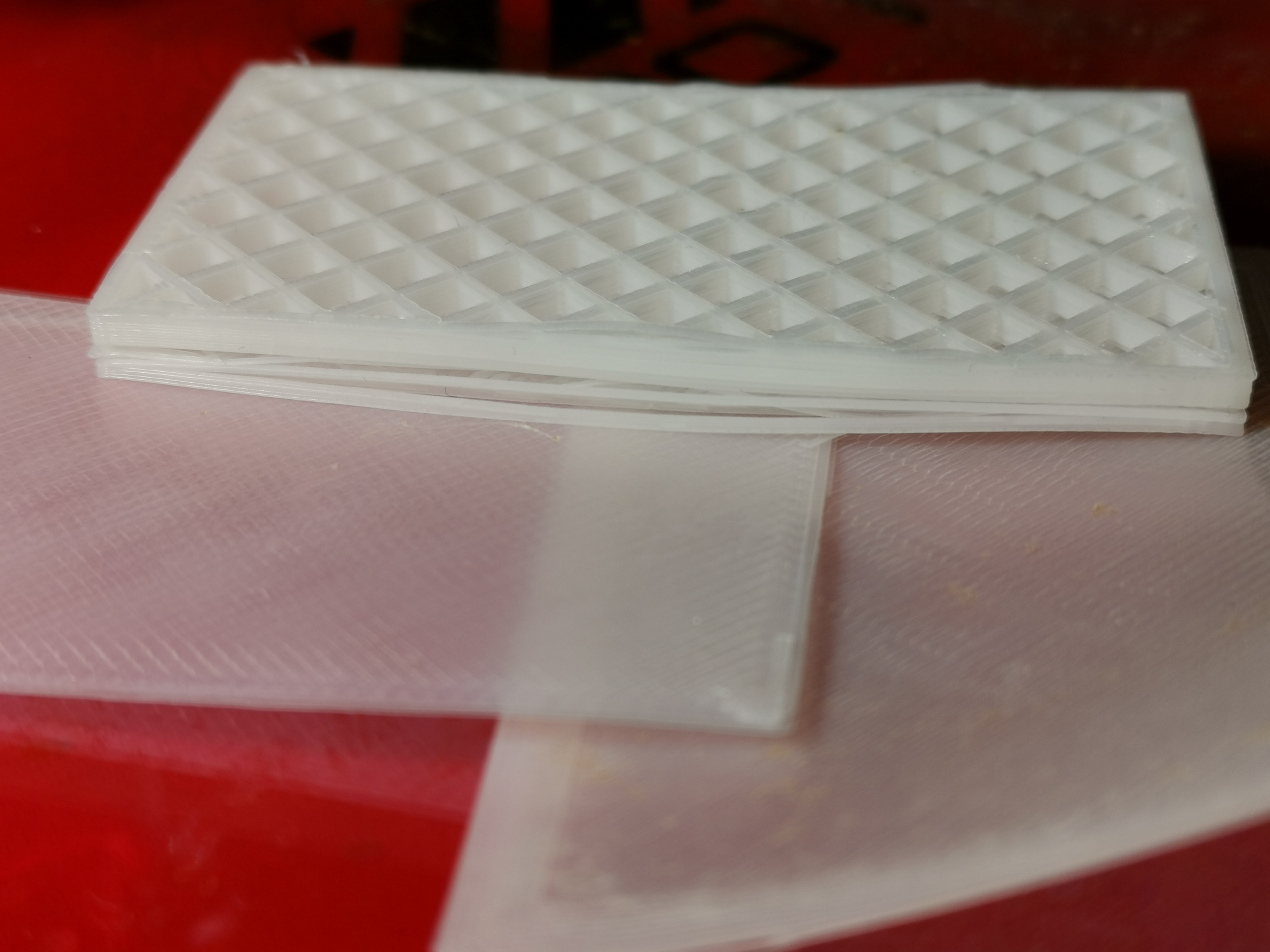 Что ж, заряжаем на печать тестовой модели. Производитель указал температуру экструзии - 250-270 'С, t стола - 100 'C. Начнем с 250 'С. Скорость печати - 40 мм/с, сопло - 0,4 мм, поток - 90%, высота слоя от 0,12 мм до 0,2 мм, ретракт - 1 мм (директ). В итоге модель небольших размеров разрывается по слоям руками. Причем заметил интересную вещь: первые слои укладываются идеально, но, по мере роста высоты, из сопла вырываются пузыри. Будто закипает пластик, про воду и не подумал. Уменьшать t уже нельзя, ведь межслоевая адгезия уже на пределе.