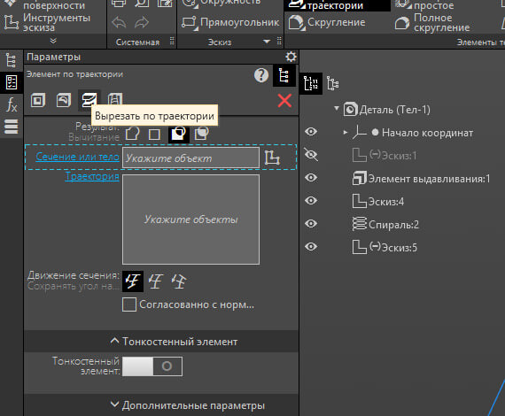 вам необходимо ввести сечение-это наш профиль зубца, а также направляющий объект-это наша спираль. и уже после того как вы это введете уже будет видно прекрасную проекцию, остается нажать на галочку.