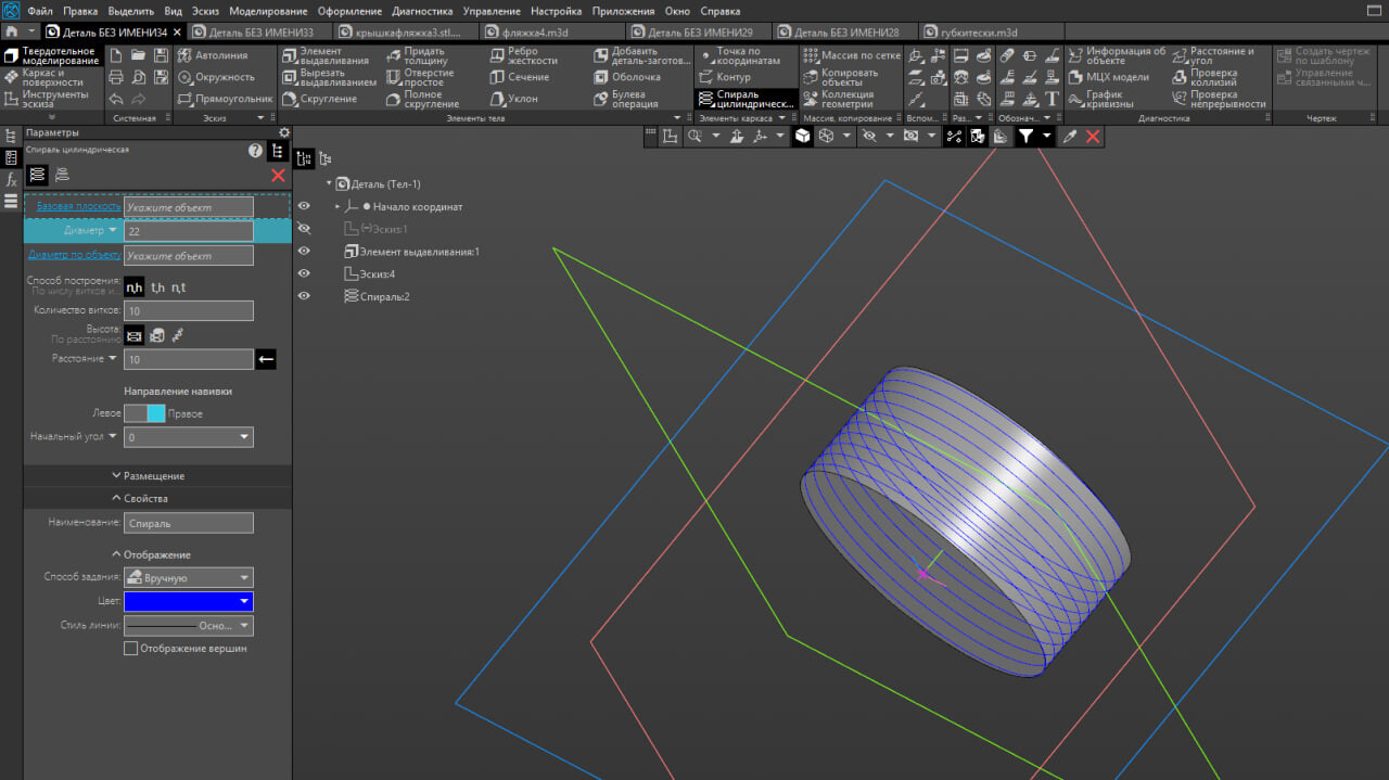 2) чтобы задать шаг, диаметр и длину, ну и в целом траекторию я использую спираль. для неё необходимо выбрать плоскость одного из оснований цилиндра и после в поле инструментов нажать на кнопку "спираль цилиндрическая"