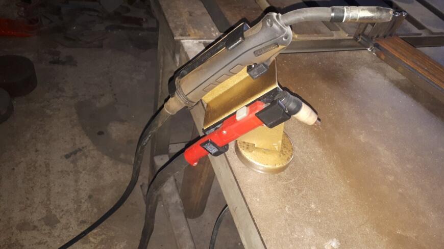 Немного удобства сварщика, если надо работать совестно плазморезом и углекислоткой. На стальной основе прикручены напечатанные держатели, в которых держаки сидят ровно, не пытаются вывернуться и при этом их легко извлекать.