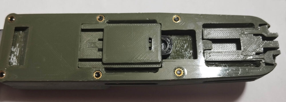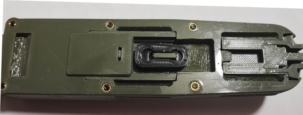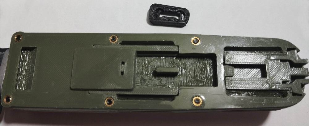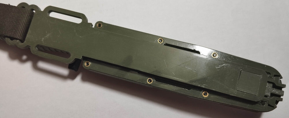 В автоматических же ножнах требуется дополнительный прижим клинка для того, чтобы он не болтался в полости ножен. Для прижима я использовал подпружиненный рычаг из ПЭТ, или РА-12, смонтированный в донной части ножен. При многократном извлечении/вкладывании клинка этот рычаг оставлял царапины и потертости на поверхности металла, что мне, естественно, не могло нравиться:
