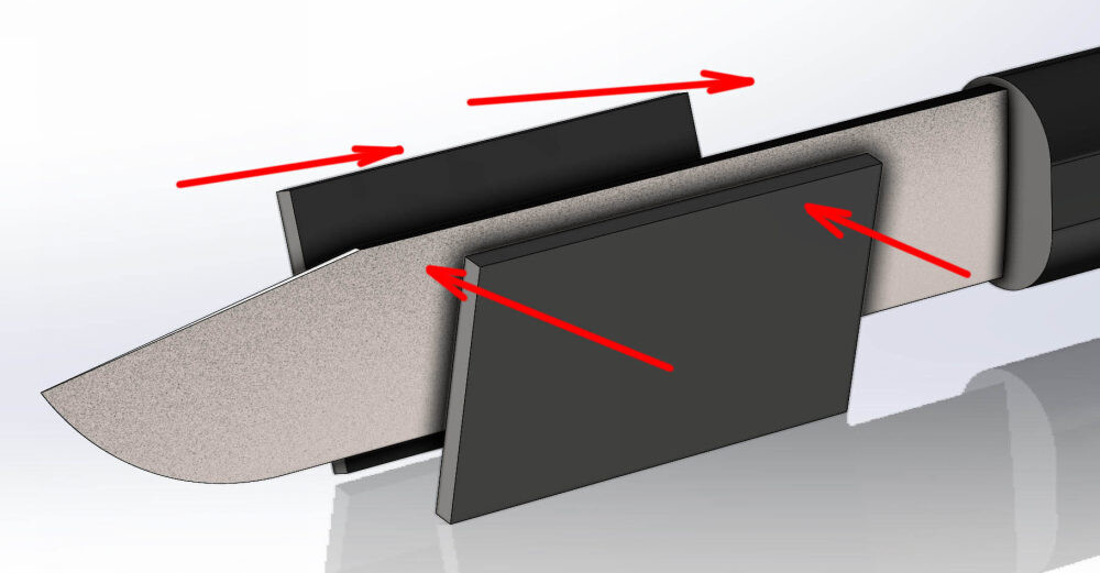 Итак - обжим. К этому варианту я не раз возвращался и каждый раз бросал его, ибо каждый раз что-либо мешало сделать работающий образец. Самое главное, это то, что зажимающие клинок поверхности должны быть не параллельными. Они должны повторять углы спусков и сужения клинка к носку. Без выполнения этого условия добиться надежного обжима не получится. Обжатие клинка должно выполняться с довольно хорошим усилием, что предъявляет свои требования к прочности деталей и способам их взаимодействия между собой.