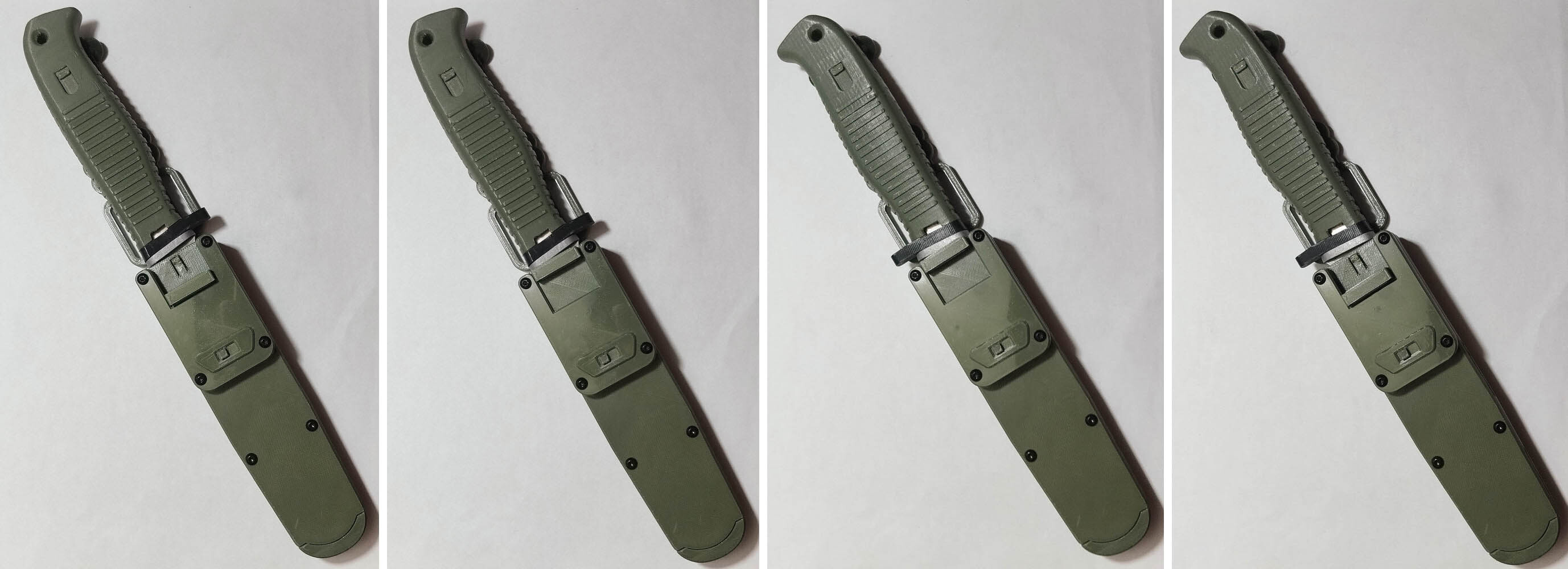 Для фиксации ножа необходимо сдвинуть клавишу манипулятора вниз до щелчка. Для освобождения ножа необходимо отвести в сторону маленький слайдер на крышке. Механизм работает с сильными щелчками. Это является одним из его недостатков. Сила удержания ножа в ножнах составляет, оценочно, 10 кг. Такого усилия достаточно для того, чтобы не потерять нож и в то же время позволяет бесшумно выдернуть его из ножен, при необходимости.