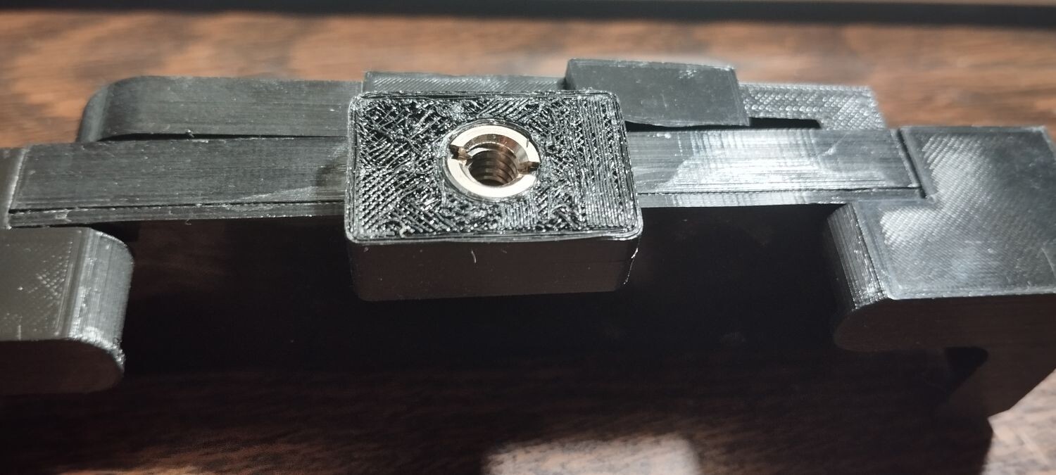 Мне нужна была шероховатая поверхность опорной площадки с резьбой 1/4'' в ней. Шероховатость должна предупреждать от проворота относительно съемной/опорной площадки штатива при закручивании фиксирующего винта. Шаманить 3Д-структуру я поленился и просто приподнял деталь над столом на поддержках, но не рассчитал малость. Получилось непрезентабельно, но ведь не подарок же на 8 марта делал и не на Озоне продаю.