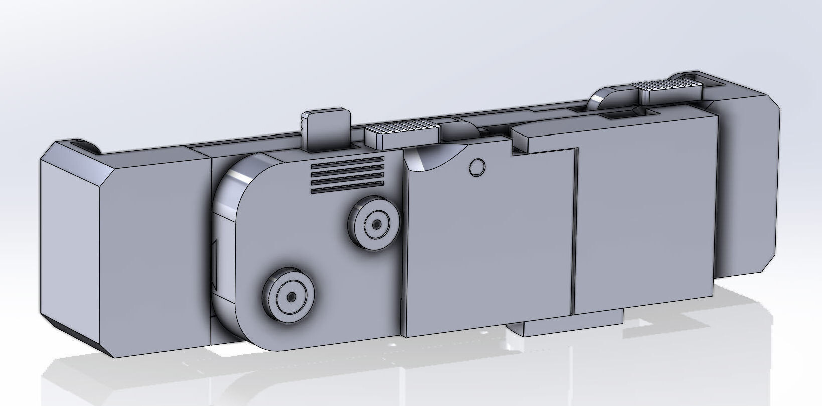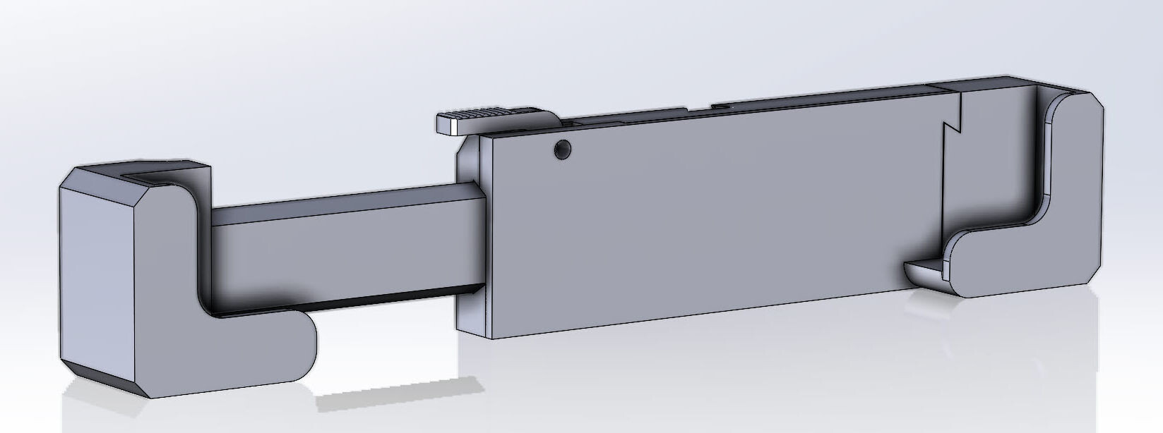Поначалу я хотел сделать девайс, в который можно вставить небольшой планшет, поэтому в первом варианте сделал губки синхронно выдвигающимися на штангах из центральной коробки, что позволяло достичь расстояния между ними от 137 мм (длина Samsung Galaxy S III, например) до 215 мм: