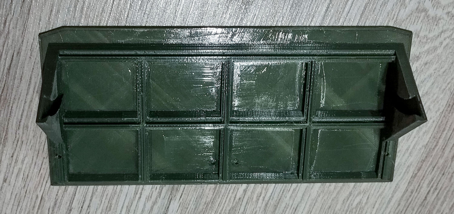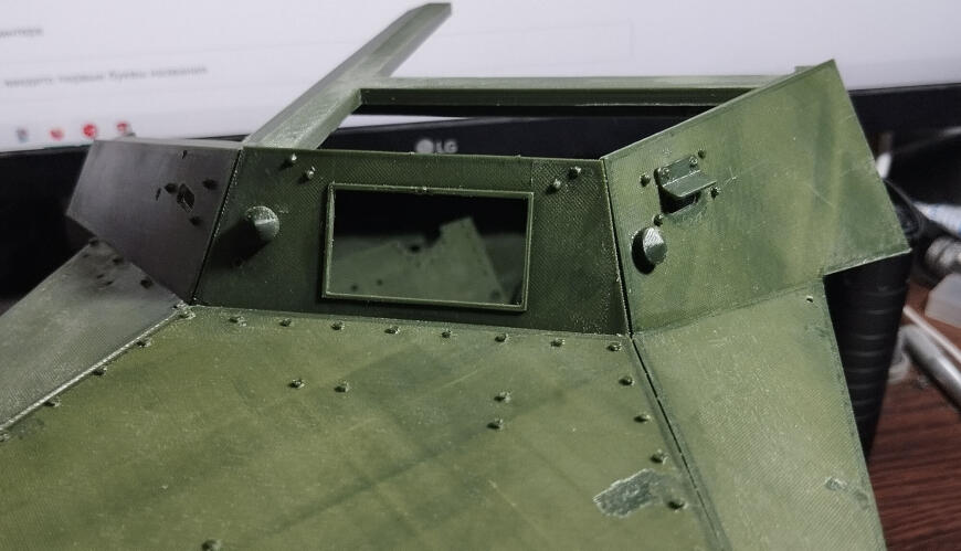 Первый: крайне желателен, но не обязателен, IDEX-принтер. При печати танка я работаю только одним соплом, d =0,2 мм. Это вытекает из требований к минимальному размеру отдельных деталей, типа головок болтов, заклепок и прочих. Следует признать, что получаются эти детали с большим трудом и не всегда напоминают чертеж. То есть необходимый минимум размеров достигается на грани возможного. В то же время бронелисты, несмотря на толщину всего в 1,5 мм, и каркас печатаются очень долго. Верхний бронелист левого борта, например, печатался около 6 часов. Этот лист фактически голый, на нем всего 3 заклепки. С учетом возможных косяков в процессе печати, типа внезапных и необъяснимых пропусков подачи экструдером, такое время неприемлемо. Думается мне, что IDEX-принтер, оснащенный соплами 0,1 и 0,4 мм вполне справился бы с обозначенными проблемами. Сопло 0,4 мм позволит в 2 раза сократить время печати больших деталей, а сопло 0,1-0,2 мм позволит оперативно допечатать на их поверхности головки болтов и заклепки.