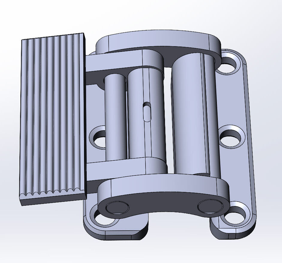 Замок представляет собой 3 крючка, соединенных шарнирно и 3 петли, соединенных так же шарнирно и качающихся друг относительно друга на, примерно, 5 градусов вверх-вниз. Круглые отверстия справа и слева предназначены для продевания в них шнурков. По задумке автора этот замок пришнуровывается к торцу правого и левого берца, или в накладку. Положение замка, при комфортных ощущениях на ноге, обеспечивается усилием затяжки шнуровки при монтаже замка на обуви. Шарнирное соединение между собой крючков/петель обеспечивает примерное повторение подъема стопы.