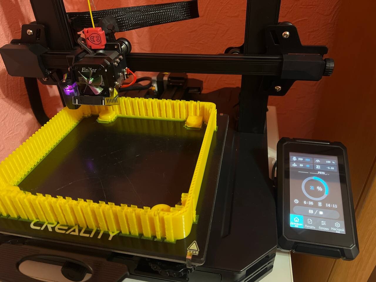 Учитывая что мой принтер Ender 3 s1 pro проклят моей криворукостью, я боялся что не получится напечатать корпус, но через 19 часов стало ясно ято я ошибался, не без деффектов небольших, но корпус получился и всё встало на свои места. Печатал пластиком PETG сопло 0.4 на стандартных настройках слайсера ender.