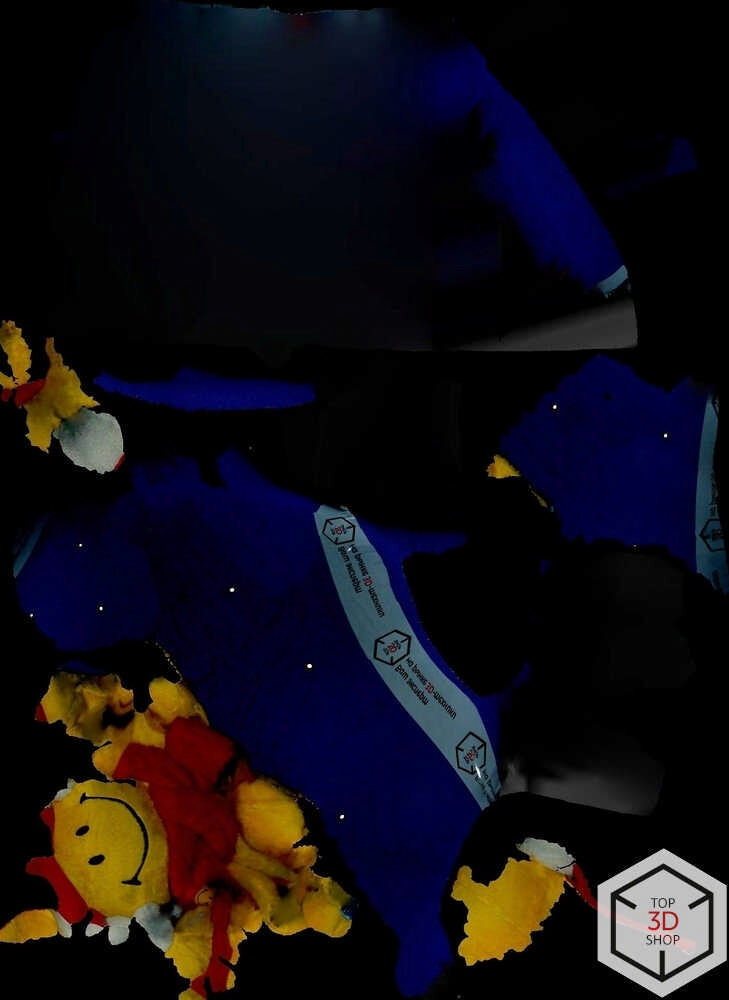 Цвета игрушки на скане выглядят насыщеннее, чем в жизни. Несоответствие корректируется в программе. В процессе сшивки на модели появились несколько синих элементов, видимо камера захватила оттенок платформы. Этот недочет устраняется в процессе автоматической ретопологии.