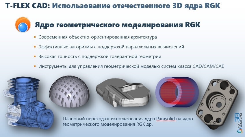 Но на этом запас новостей не закончился. Сергей Козлов рассказал об основных направлениях развития систем комплекса T‑FLEX PLM, а также о создании и использовании отечественного 3D-ядра — RGK. Этой теме был посвящён отдельный блок демонстрации. Во время неё слушатели познакомились не только с этой интересной инновационной и очень многообещающей разработкой компании «Топ Системы», но и получили наглядное представление о том месте, которое 3D-ядро занимает в составе CAD-системы. Этот рассказ, с одной стороны, изобиловал серьёзными теоретическими выкладками, а с другой — был прост и нагляден, поскольку рассказывал об этом человек, занимающийся проектированием 3D CAD ни много ни мало – 30 лет. Впоследствии слушатели отмечали, что узнали много нового, а для многих и удивительного. «А геометрическое 3D-ядро, оказывается, не такая уж непонятная вещь. Но самое поразительное, что это всего лишь 20% от самой CAD системы… Никогда не задумывался, насколько в этом ПО много разных технологий» — отметил один из участников конференции.