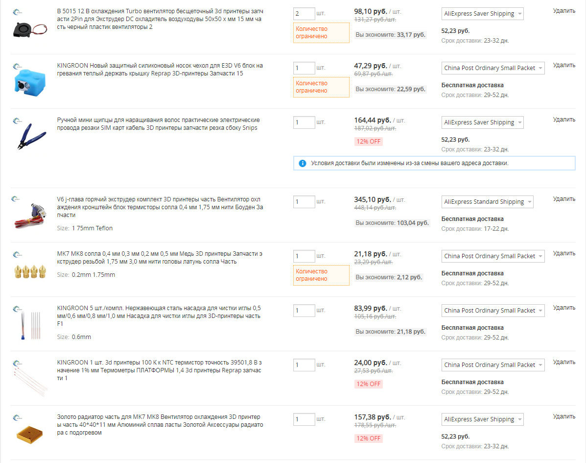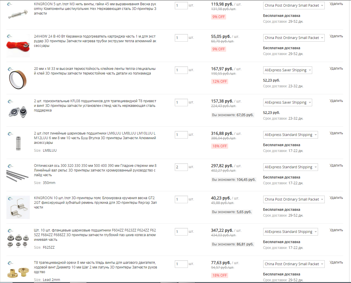 Про рычаги могу сказать, что они почти работоспособны, но я не учел неточности печати, поэтому доработаю напильником. Второй их косяк — это угол 180°, я не проверял, но, вероятно, они могут заклинить принтер в таком положении. В новой версии решится небольшой пружинкой, возможно от ручки. Были еще крепления к линейным направляющим, но я вовремя сказал не печатать их. На данный момент я представляю все детали, но не хочу наступать на одни и те же грабли, поэтому буду моделировать по месту, после заказа и получения комплектующих. О них стоит сказать отдельно. Я не очень “шарю” в их подборе, поэтому принимаю любую критику и предложения о их списке. Все, что я об этом знаю, я прочитал здесь.На данный момент мой заказ выглядит примерно так.
