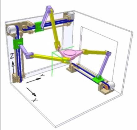 Для начала предыстория. Несколько месяцев назад один мой друг показал мне видео, на котором была анимация 3d принтера с конструкцией, которую я до этого нигде не встречал. Она меня сразу заинтересовала возможностью получения с помощью относительно небольшого принтера гораздо большей печатной зоны. Согласен, звучит не очень понятно даже для меня, но это пока. Сам принтер — это три оси, каждая из которых состоит из двух рычагов.