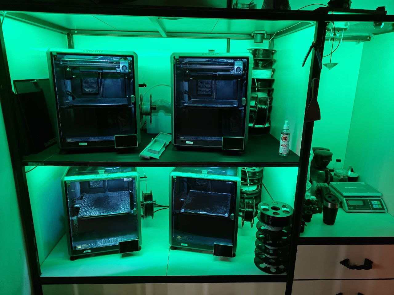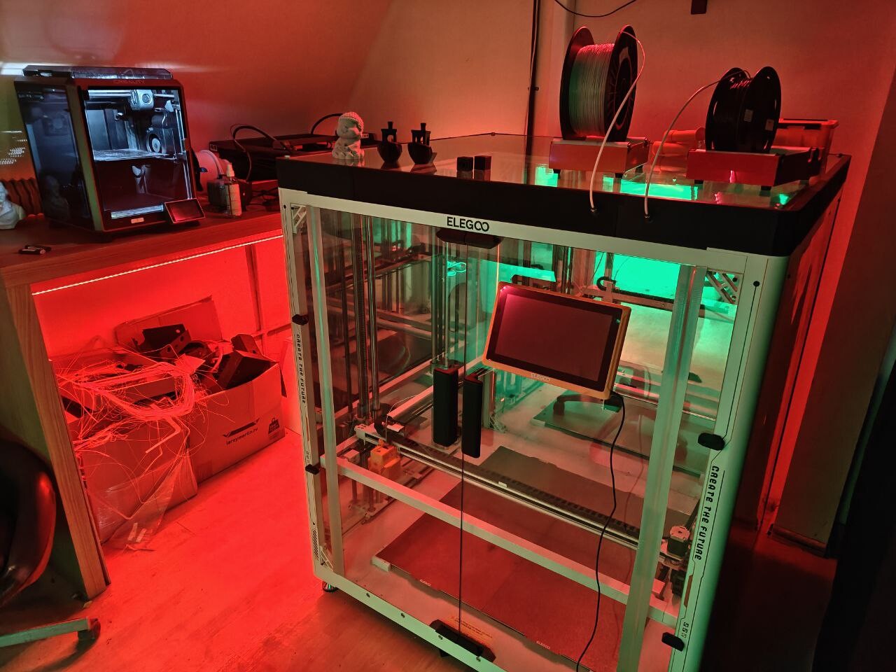 Так же важный момент, регулируемая подсветка, ее на всех фото видно. Включать, выключать, менять цвет и режими можно энкодером, можно через Home Assistant. Еще висят несколько камер, смотрящих за процессом печати снаружи (внутренние камеры в Creality иногда глючат, я думаю от температуры).
