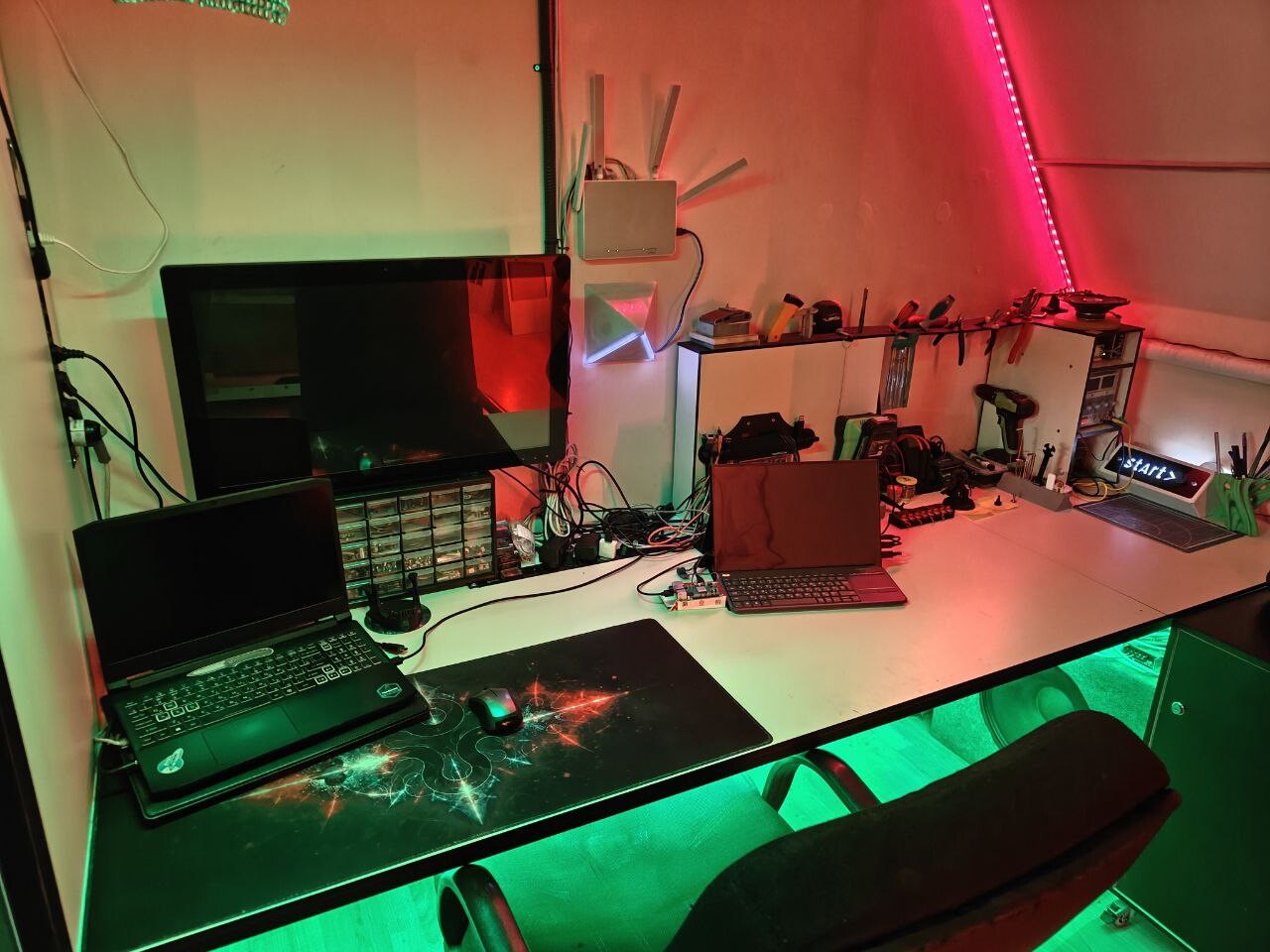 Итак, рабочее пространство. Было много итераций, переездов, перестроек, но на текущий момент все так. Большинство процессов начинается с поиска информации, моделирования, создания рендеров, разработки плат или чего-то ещё виртуального. Для этого у меня ноут (иногда нужна мобильность, для внешнего оборудования, например плоттера в соседней комнате).