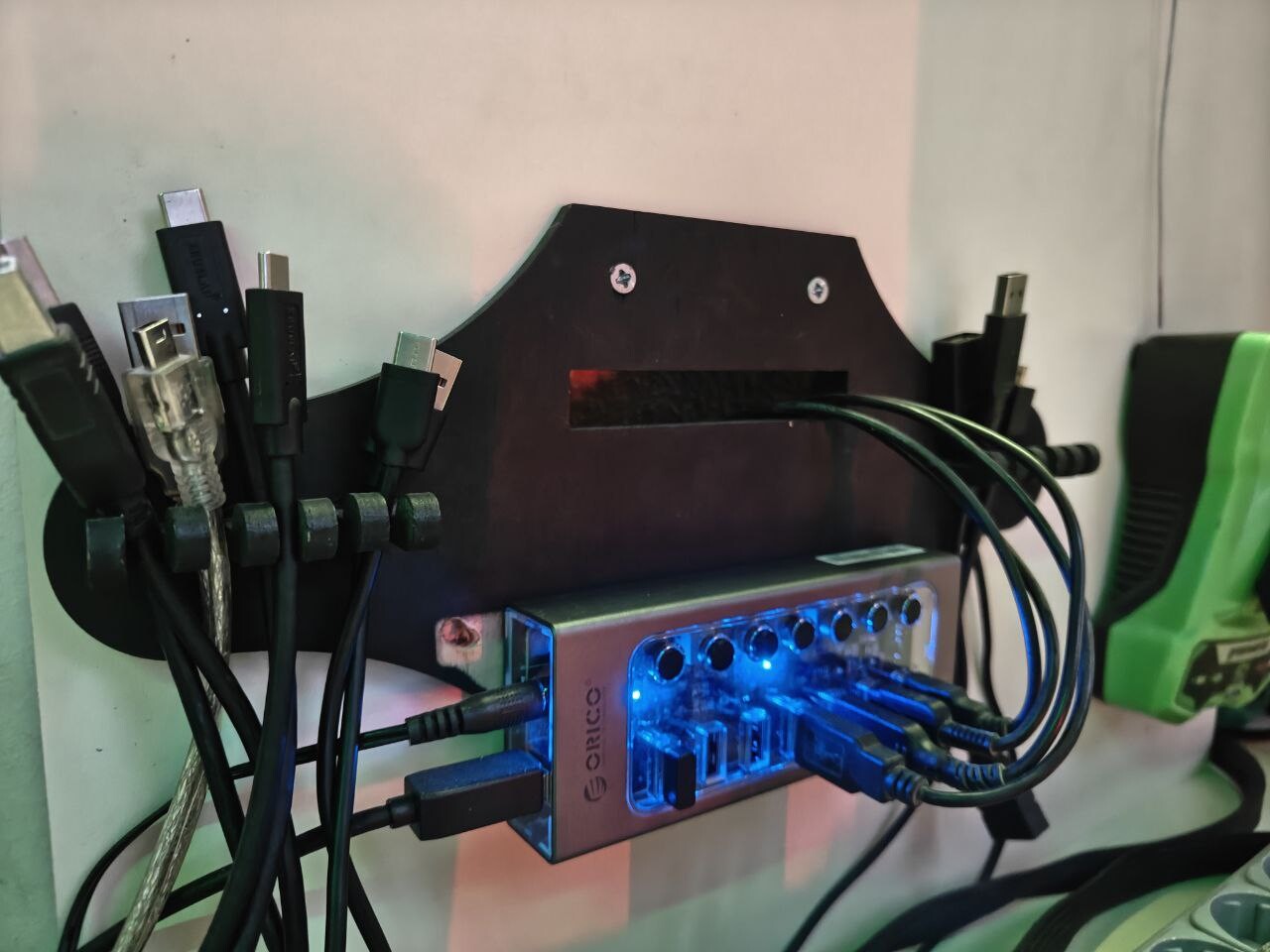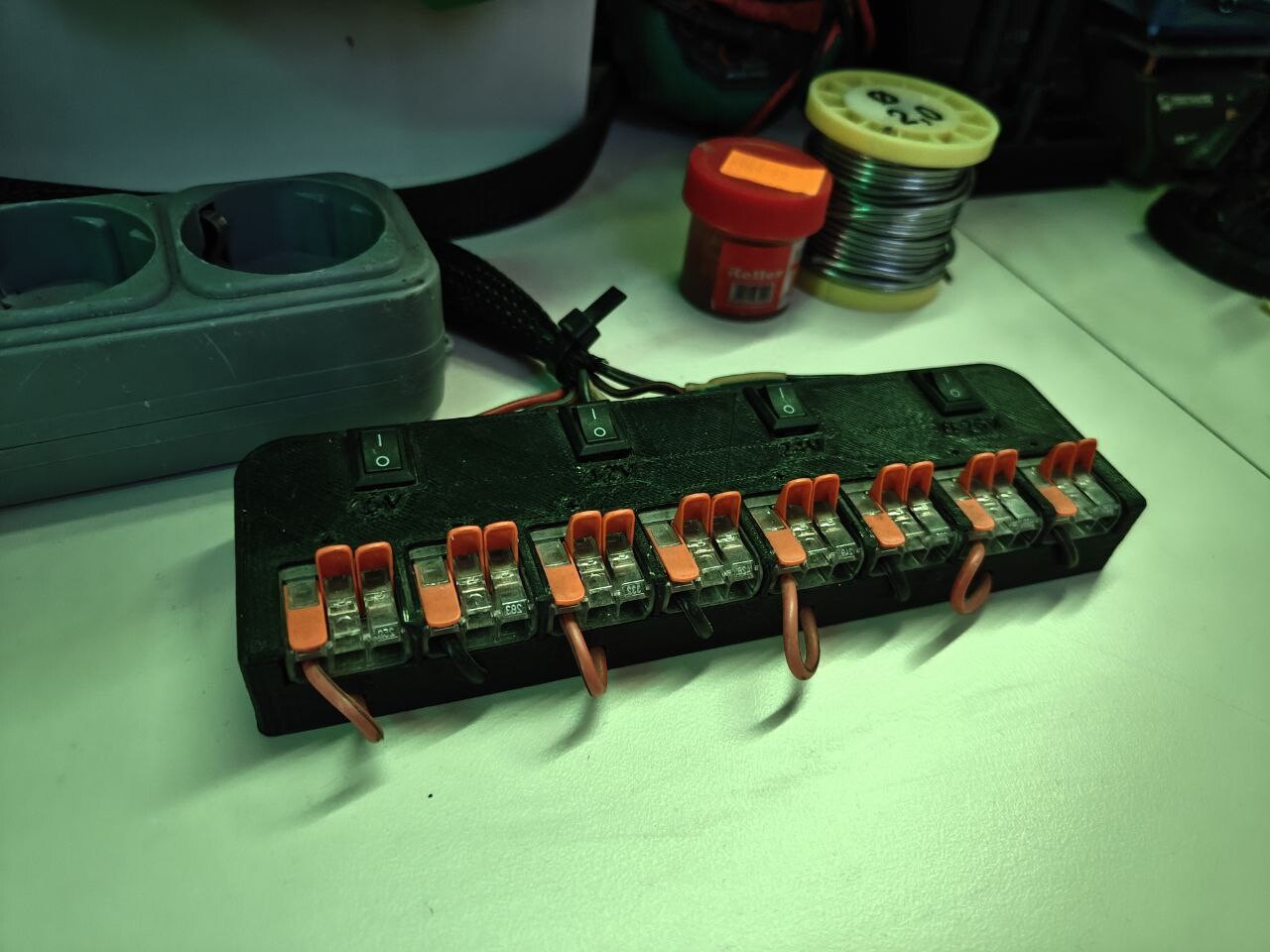 Следующим этапом - тестирование и отладка узлов. Для этого, на столе, в небольшом объеме, я постарался максимально удобно собрать все необходимое. Вывел питание для компонентов с компьютерного БП, 24В блока питания (ну нету в БП от ПК 24В линии) и лабораторного блока питания (выставил нужное напряжение, подключил прибор и смотришь сколько ампер он кушает, а если по нулям, то прибор твой не исправен), рядом розетки. Так же USB хаб для подключения ардуинок и подобного. Ну и базовый инструмент под рукой. Пациента можно положить на стол, закрутить винты, подать питание и подключить к хабу- и не надо ничего перекладывать, тянуть провода и т.п.