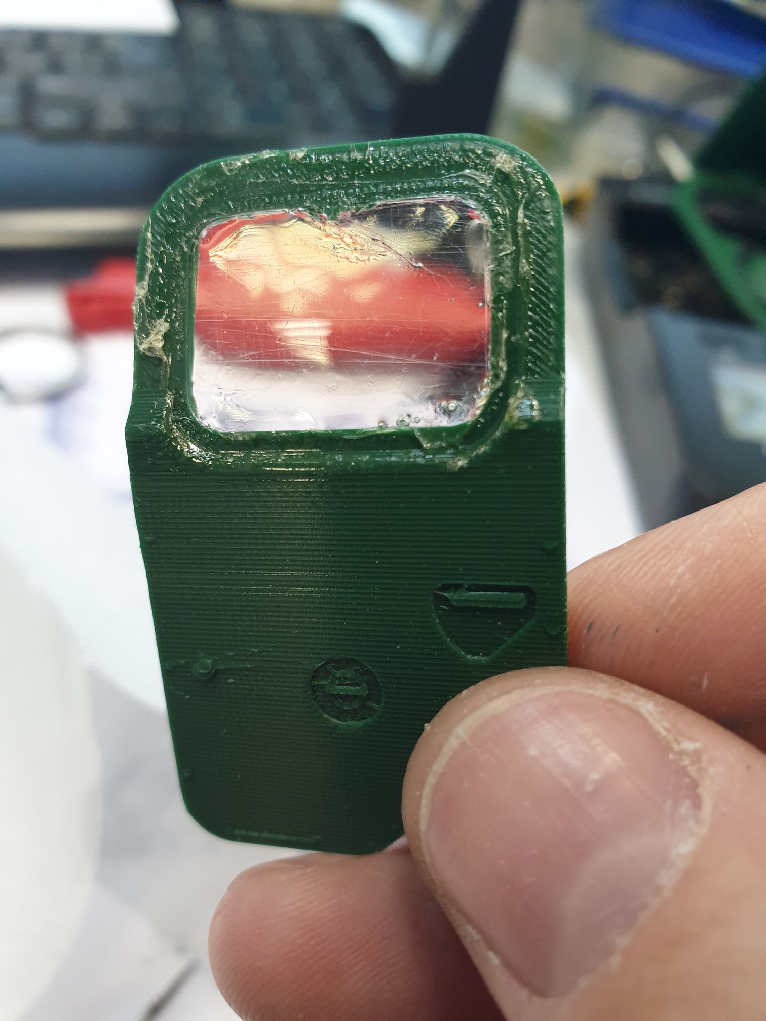 Из пленки (смола к ней не приклепает) вырезаю деталь перекрывающую окошко с запасом и приклеиваю на БФ-6 (он потом без следа удалится спиртом) на внешнюю сторону двери. С внутренней стороны ровным слоем заливаю смолу и отверждаю УФ-лампой. Окно получается слегка выпуклым (зависит от количества смолы). При наличии контакта с воздухом на смоле остается тонкий липкий слой, который также удаляется спиртом. Если есть желание можно налить смолы точно вровень и внутри также накрыть лавсановой пленкой - тогда липкого слоя не будет и обе поверхности будут плоскими (но у меня так получалось не всегда, иногда получались пузыри и я остановился на первом варианте).