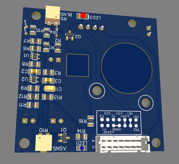 С выхода OPA333 усиленный сигнал датчика подается на компаратор MLV393. Порог срабатывания компаратора задается другим потенциометром, и может выбираться в диапазоне от 0,1 вольта до 1,5 вольт. Это соответствует изменению нагрузки на сопло примерно от 1 грамма до 40 грамм. При срабатывании компаратора включается светодиод, индицирующий 0 по оси Z.