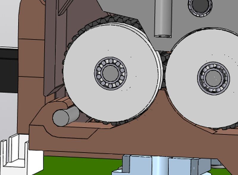 После расточки отверстий крышка редуктора демонтируется с каретки, и начинается установка колес редуктора. Первым устанавливается одно из подающих колес с 37 зубьями, которое сидит на валу (на оси) диаметром 3 миллиметра и длиной 16 миллиметров. Вал заводится в посадочное отверстие через выборку в теле каретки для ползуна натяжителя ремня. Вал подающего колеса фиксируется с помощью установочного винта М2х3, вкручиваемого в резьбовую вплавленную втулку на верхней части каретки. Позднее это отверстие будет перекрыто нижней крепежной лапкой крышки редуктора. Такие же втулки с резьбой М2х3 вплавляются в нижнюю часть каретки. К ним будет крепиться балка тензодатчика. Все остальные вплавляемые втулки на теле каретки имеют резьбу М2,5.