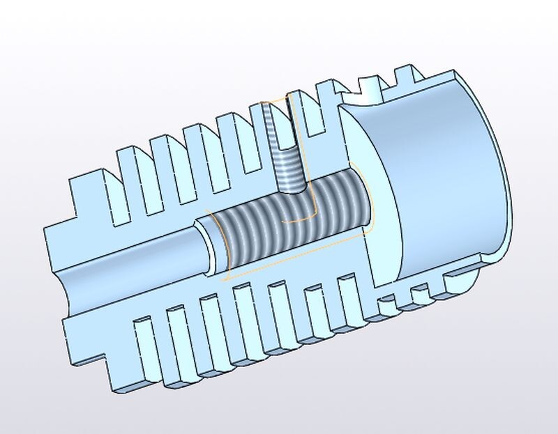 Теперь несколько слов о конструкции нагревателя. Он выточен из меди, и имеет диаметр 12 мм. Длина – 12,5 мм. В нижней части проточка до диаметра 9 мм, на которой нарезана резьба М9х0,75. В верхней части сделаны глухие радиальное и тангенциальное отверстия диаметром 3,2 мм, в которые можно установить бусинку терморезистора. По оси нагревателя просверлено отверстие, и нарезана стандартная резьба М6х1. Снизу в нагреватель вкручивается сопло, сверху, «стык-в-стык» с верхним торцом сопла вкручивается стержень термобарьера, который своей верхней частью вкручивается в радиатор на нужное расстояние, что позволяет регулировать расстояние от каретки до выходного отверстия в сопле. Такая конструкция имеет всего один торцевой стык между телом сопла и подводящим концом термобарьера, что существенно снижает вероятность выдавливания расплавленного пластика куда-либо кроме отверстия в сопле. Эта конструкция была разработана (и изготовлена) еще пять лет назад, и только сейчас оказалась востребована.