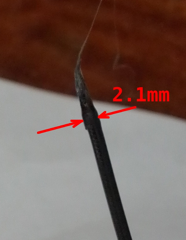 На фотографии пруток PETG. Сопло было нагрето до 210 градусов (вместо 235, при которых он печатается). И я сначала задвигал пруток (руками) до его остановки в сопле, а потом резко выдернул. При таком способе пруток не успевает плавиться вне сопла (в промежутке между трубкой и соплом, если этот промежуток есть). При этом та часть которая только-только вошла в полость сопла оплавляется только наружний слой. И, собственно, останавливается тоже из-за того, что пластик не успевает плавится до такой вязкости, когда он может выдавливаться из фильеры.