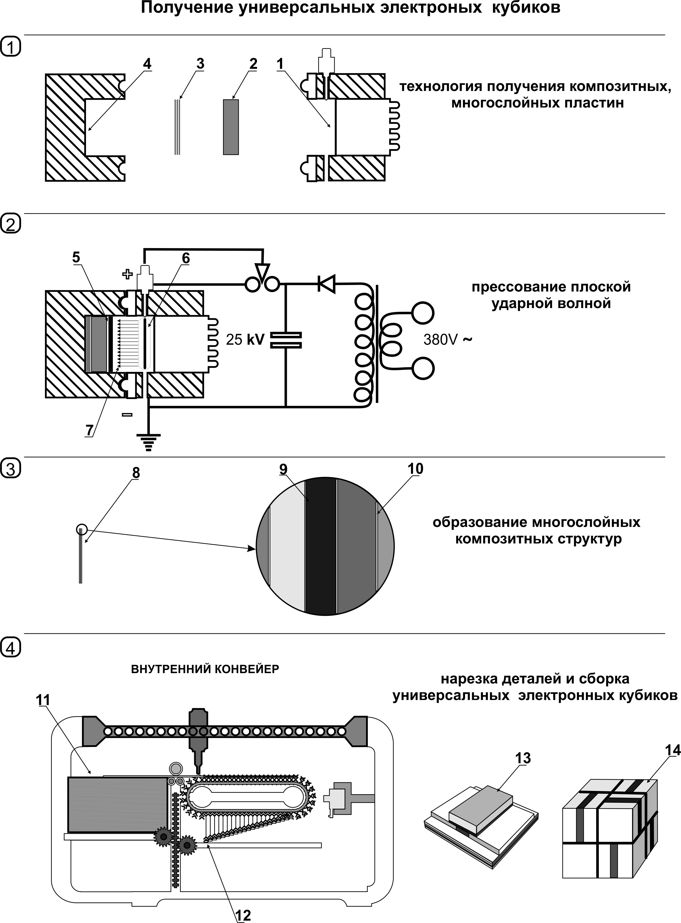 Для создания электронных кубиков предлагается использовать универсальный внутренний сборочный роторный конвейер. Необходимые материалы с заданными свойствами получают методом многослойной диффузной сварки. Эта технология позволяет создавать: