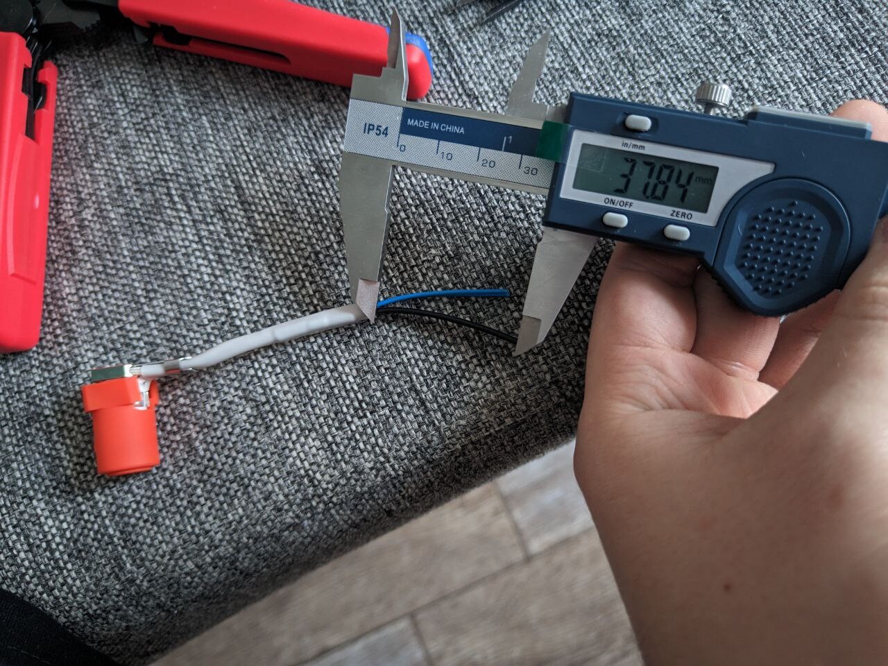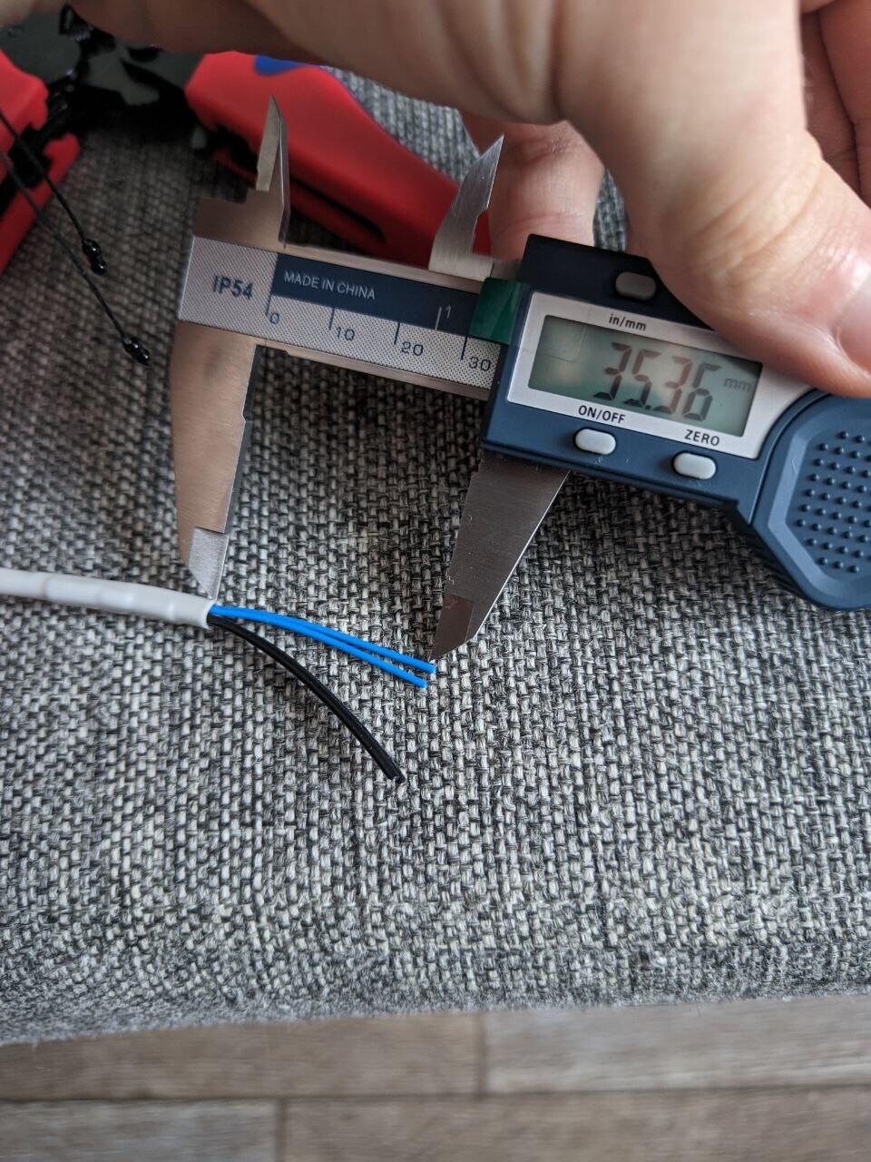 Я взял за измерение термосадку хотенда и от неё отрезал провода, оставим 37.84мм провода термистора и 30мм от питания хотенда и 35.36мм от термистора