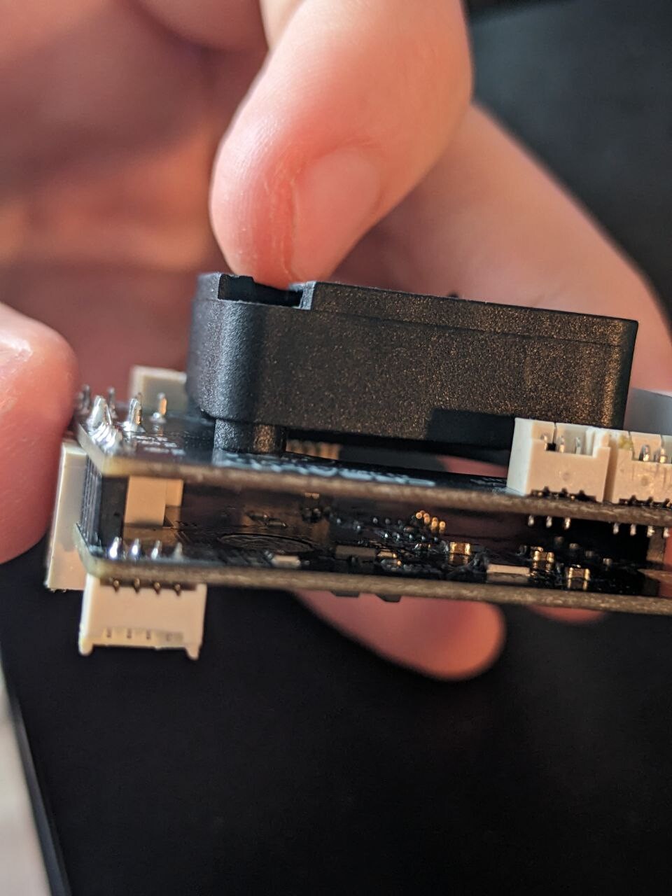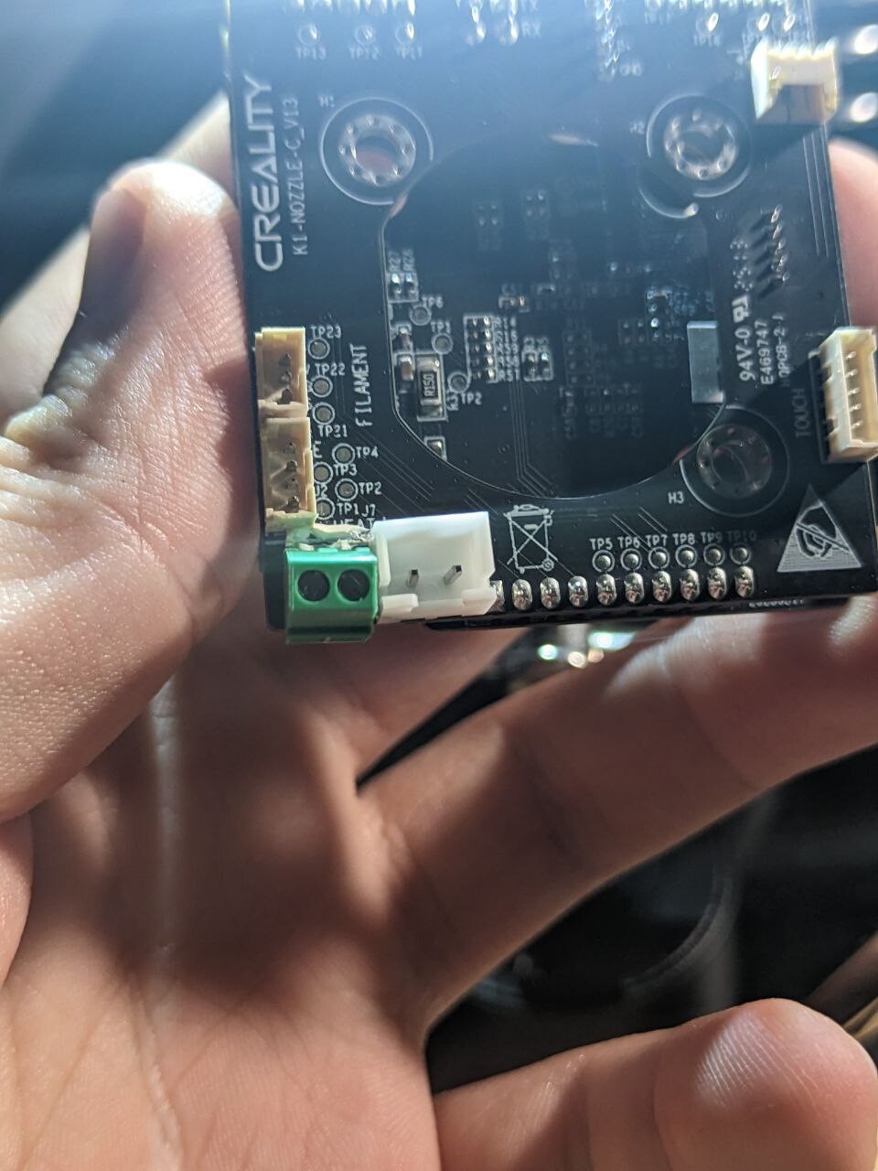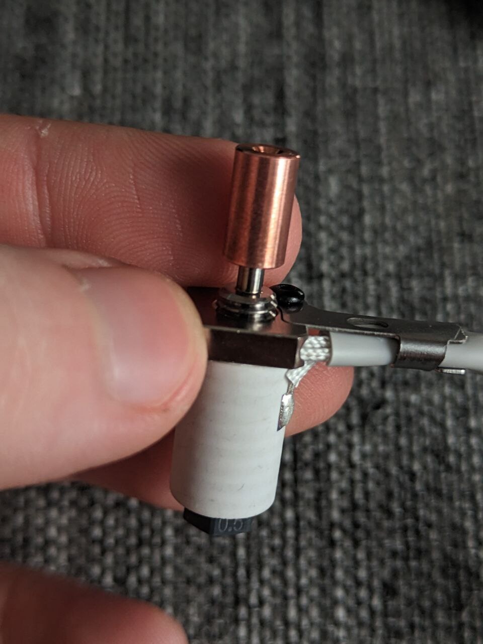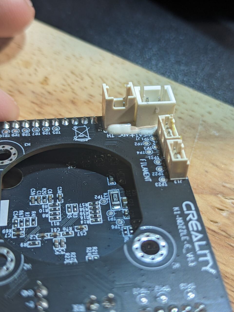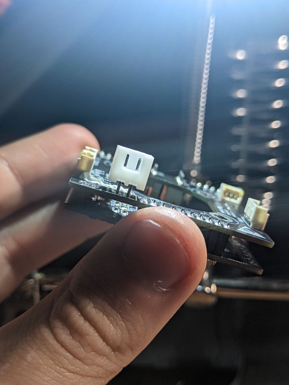 Т.к на момент фотографии автор по ходу установки хотенда переосмыслил некоторые вещи, то я установил JST XH 2.54 на место термистора. Но он оказался больше и они банально не влезал по габаритам в гнездо термистора. А вот JST PH 2.0 отлично входит и было бы правильно его туда припаять. Однако я схитрил и решил подогнуть пины так, чтобы они влезали. Разъём термистора, однако, входит также без проблем, поэтому способ рабочий