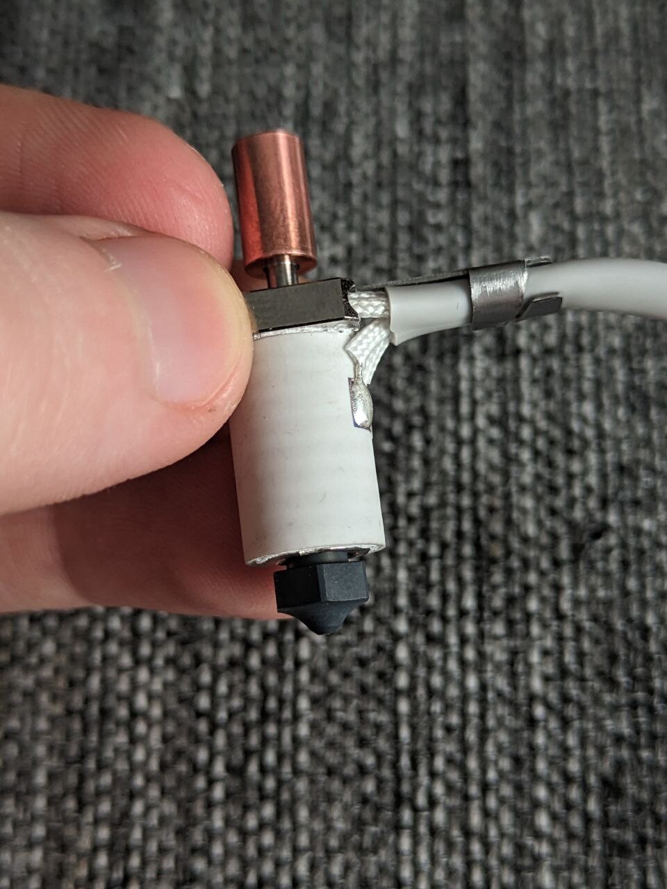 ВНИМАНИЕ! Термобарьер должен быть скручен полностью (как на фотографии), а сопло должно быть вкручено в хотенд и чтобы оно упиралось в термобарьер, но не в горло хотенда, иначе есть риск протечки филамента или, если сильно закрутите сопло, сломаете керамический нагреватель