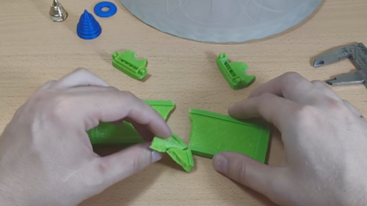 Следующее, что я спроектировал это крепление универсального ресивера Galaxy Innovations Gi HD Mini Plus для крепления на заднюю стенку телевизора, печатал PETG от Bestfilament при параметрах 240С 65С в итоге помимо того, что просчитался в расчетах и не попал креплениями в ресивер, обломались они в два счета, попробовал сломать деталь также особого усилия не пришлось прикладывать, хотя пластик PETG должен быть прочным, в разломе выглядит ячейки.