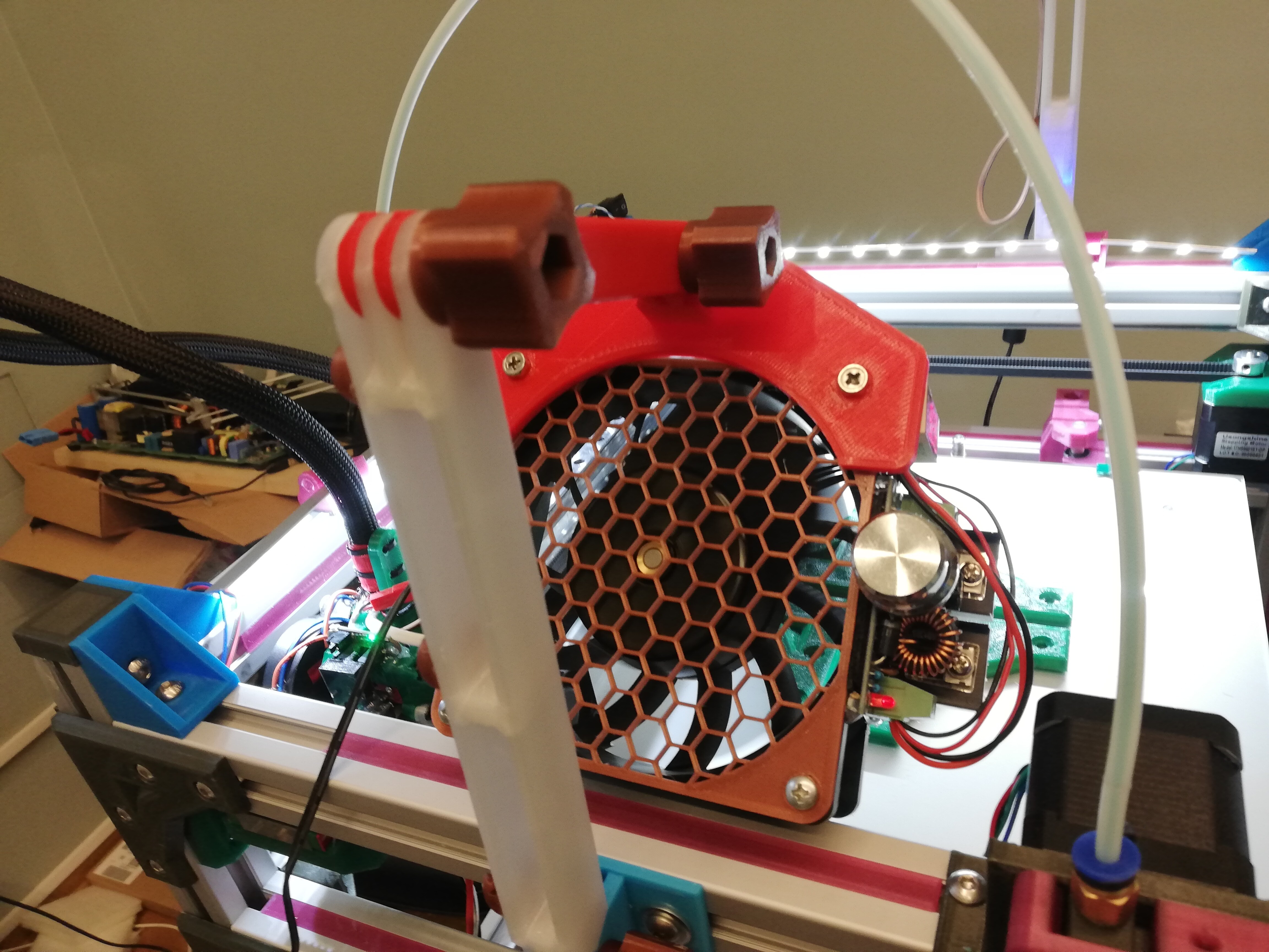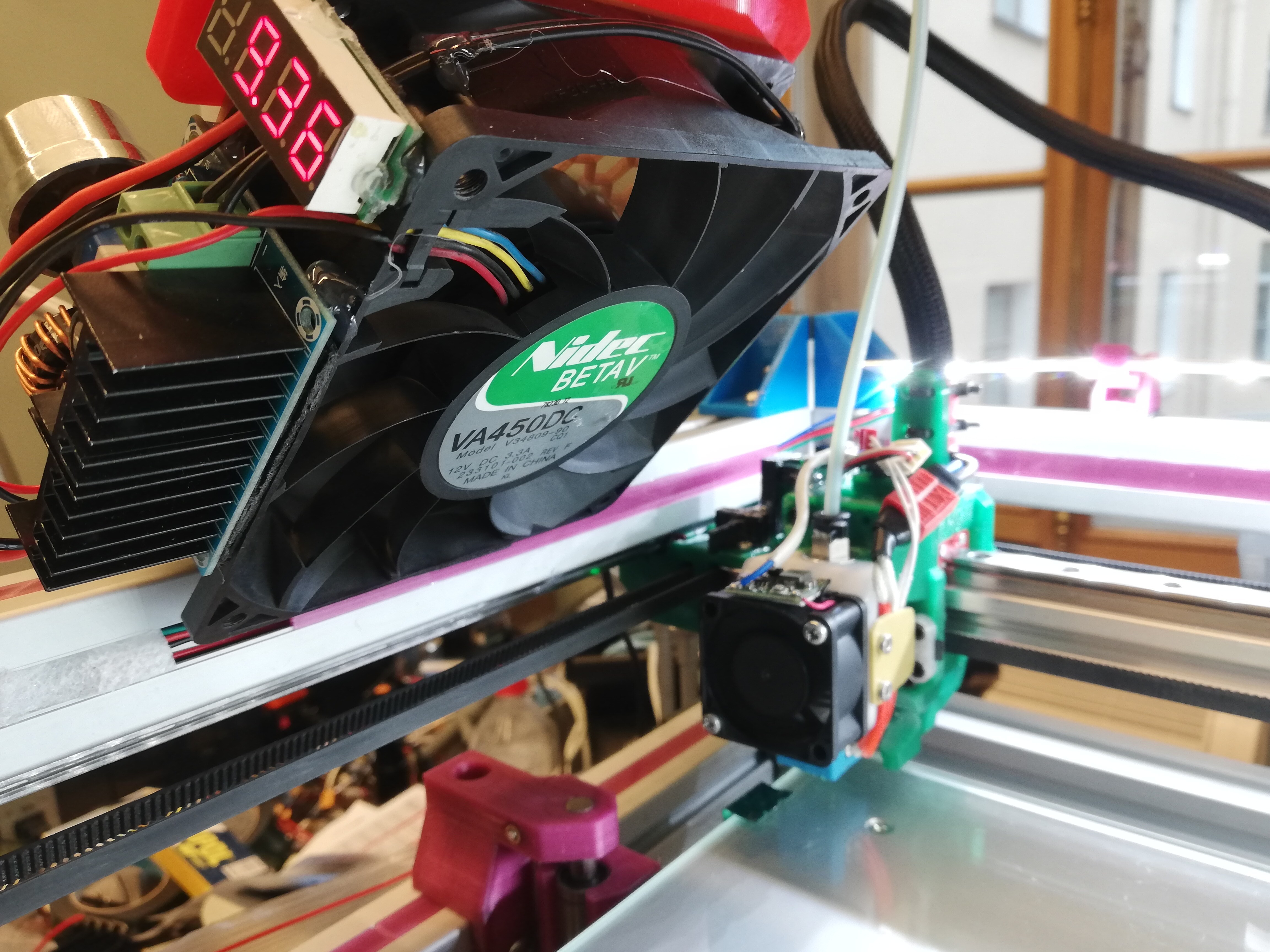 Как я понял все кто ставят 220V грелку бьются за ускоренный нагрев стола, а меня куда больше вымораживает ожидание остывания и отлипание детали от стекла чтоб запустить следующую печать. Потому приделал к принтеру вот такой кулерок 12V 3,3А так как несколько таких завалялось в заначке :-)