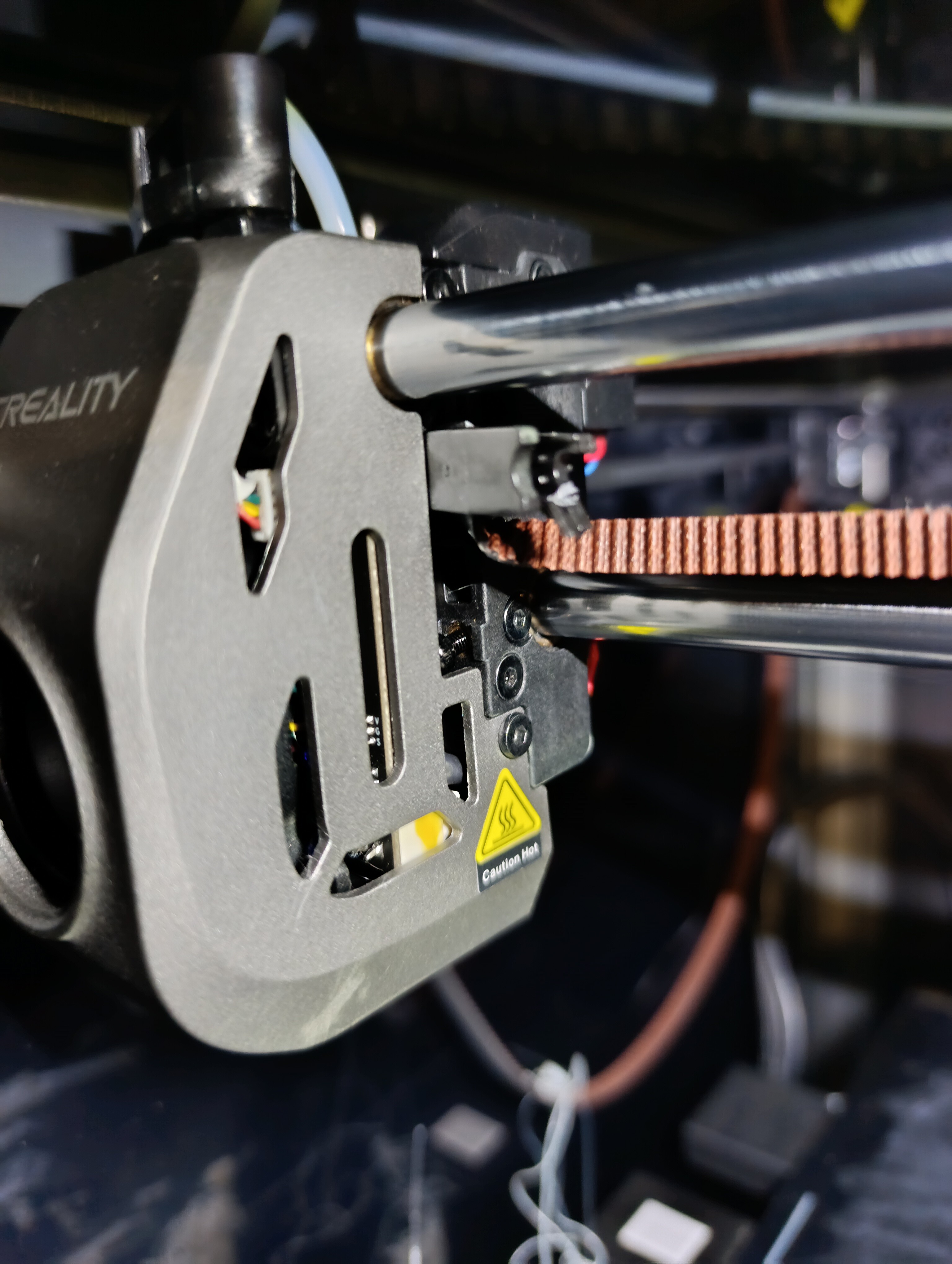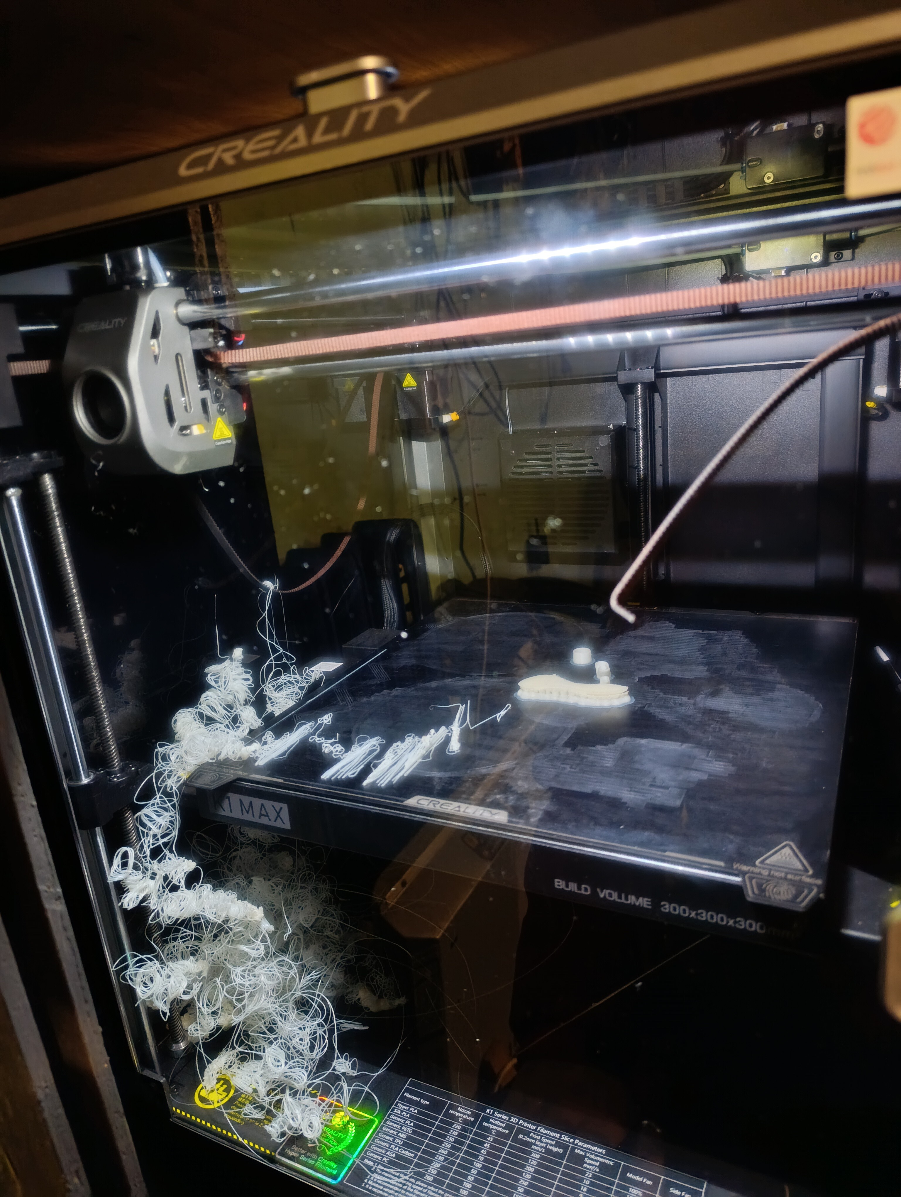 Принтер мониторю удаленно так, как он стоит в гараже, что бы дома ABSом не воняло и вот решил зайти и посмотреть, открываю creality cloud а там голова бьется в конвульсиях о каретку, болтается и ремень и волосня. Выключил, поехал смотреть.