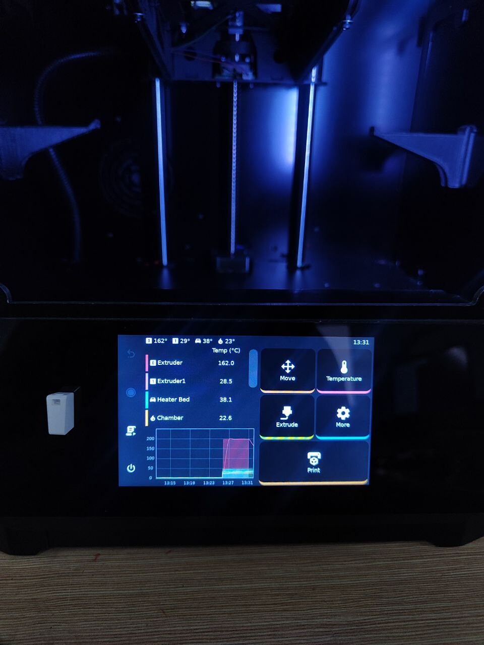 В принтере работает весь функционал - контроль подачи пластика, управление вентиляторами охлаждения/циркуляции камеры и нагревом камеры через gcode, переключение сопел (Т0/Т1) и переключение сопле с очисткой (T10/T11). В общем это не просто корч на Stage3 а вполне себе комфортный современный инструмент.