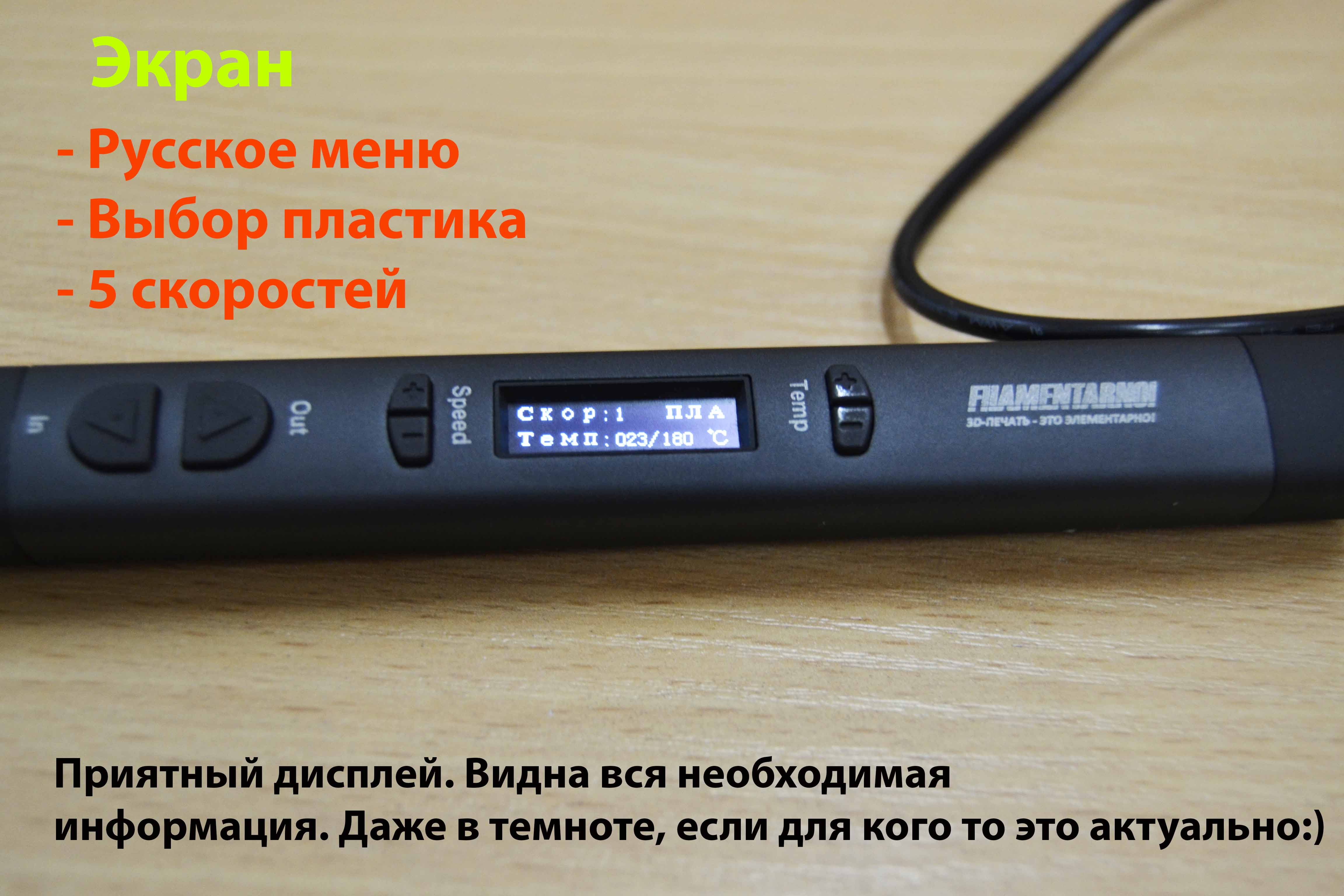 Видно четко и ярко. Вот это искренне порадовало. У меня весь парк рабочих 3D-ручек зависит от розетки. Частенько на фестах, бывают проблемы с доступом к электричеству. Пару раз приходилось отказываться от участия. Тут проблема решена,