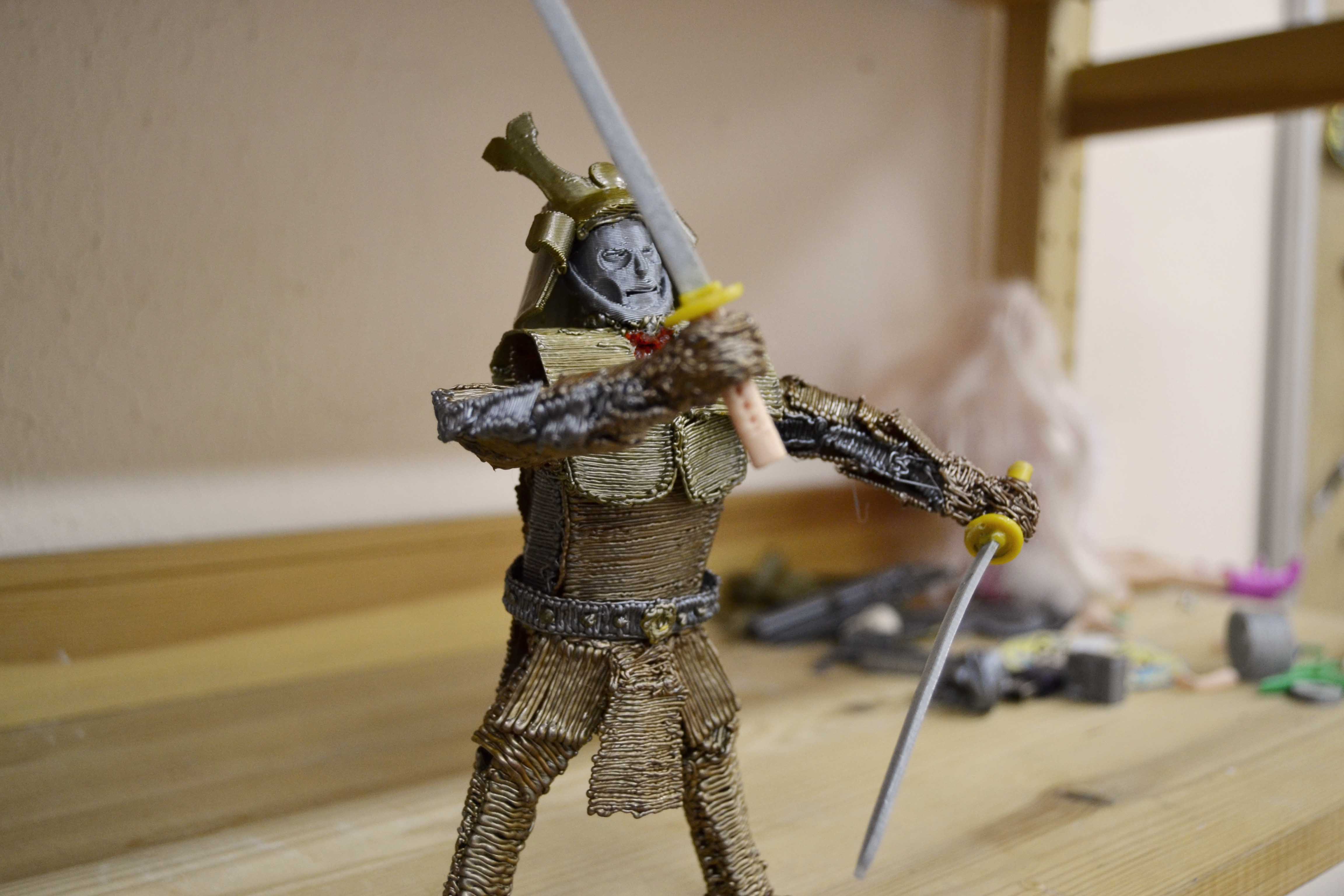 За это поставлю минус. Это понравилось. Какой бы рукой не взял, одинаково удобно. на 90% других ручек кнопки сбоку. Приноровится можно, но для левшей не очень удобно. Классная особенность конструкции.У меня была начатая работа, до которой руки никак не доходили. Было принято решение совместить приятное с приятным.Линии тоньше. Очивидно из-за конструкции сопла.Не знаю хорошо это или плохо, но это существенное отличие от других ручек. Попробовал рисовать на разных скоростях. Комфортно на всех и все имеют место быть. Больше все таки плюсик.Мы с детьми в восторге от этого пластика. На то есть несколько причин. Очень важный критерий, а тем более для детской студии, отсутствие неприятных запахов. До этого мы рисовали PLA, который так же почти не пахнет. Но PLA имеет свойство вытекать при не правильно выставленной температуре. Поймать верный диапазон бывает проблематично. С SBS ничего такого, рисовать комфортно. Моделить самурая дело достаточно как вы понимаете долгое и хлопотное.