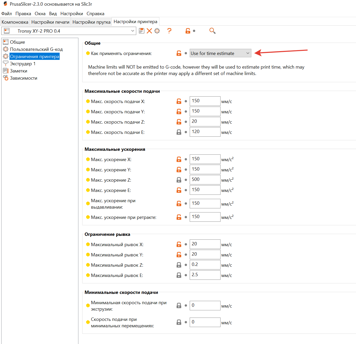 По умолчанию, при подготовки модели на печать для принтера Tronxy XY-2 PRO PrusaSlicer оценивает время печати примерно на 30% меньше, чем на самом деле. Для правильного подсчета времени печати надо в настройках программы изменить несколько параметров. Самое главное в пункте Как применять ограничения выставить Use for time estimate (использовать параметры только для расчета времени). На рис. показано стрелочкой. Собственно все остальные необходимые параметры на рисунке.