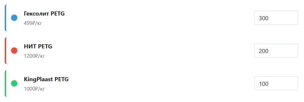 Это, пожалуй, самое крутое обновление. Раньше калькулятор мог работать только с одним типом пластика. Теперь - до 5 разных материалов одновременно!