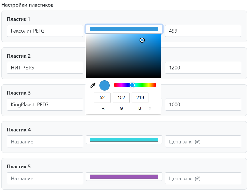 - В настройках прописываете каждый материал: даете ему название, выбираете цвет для удобства, указываете цену за килограмм