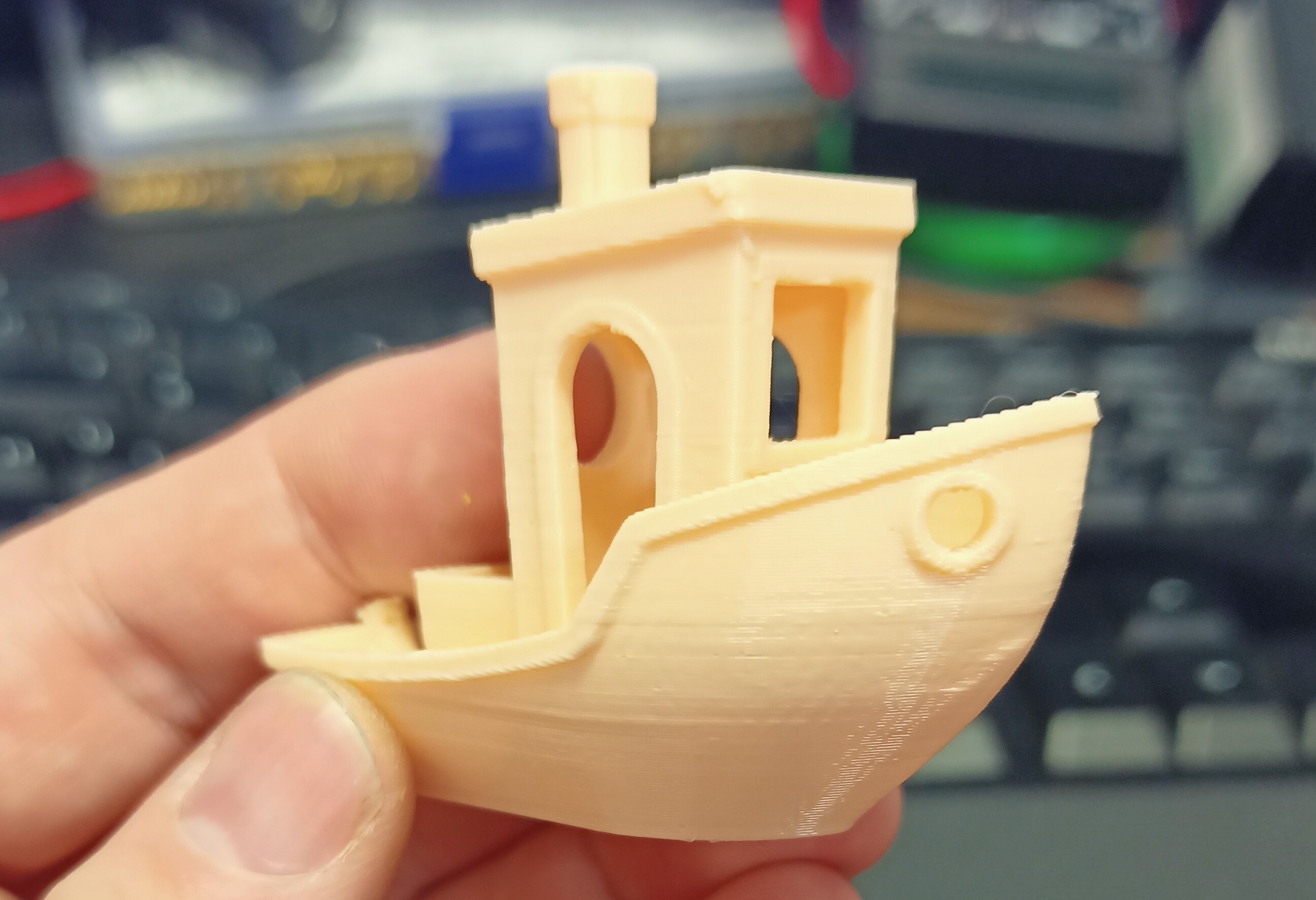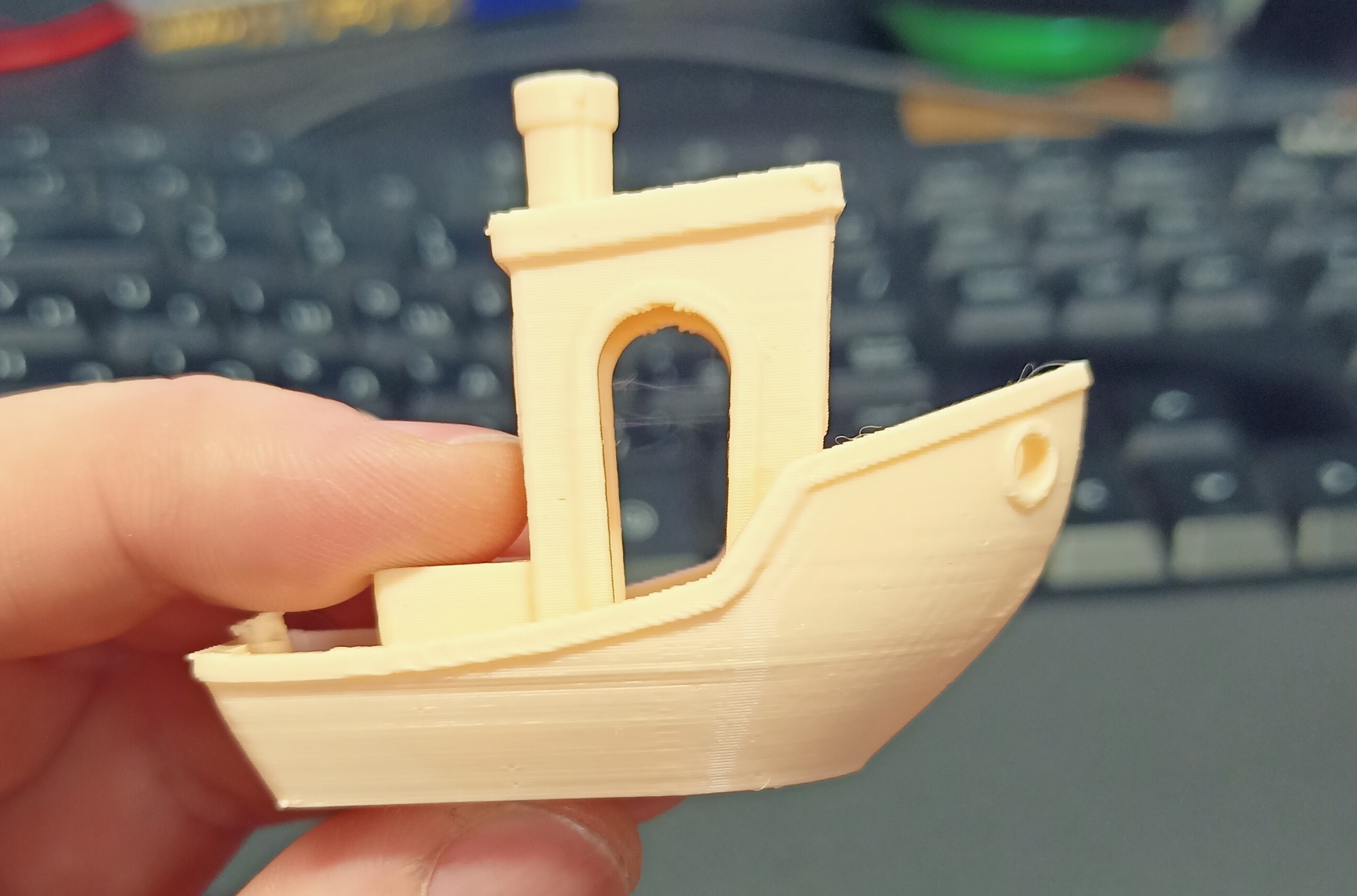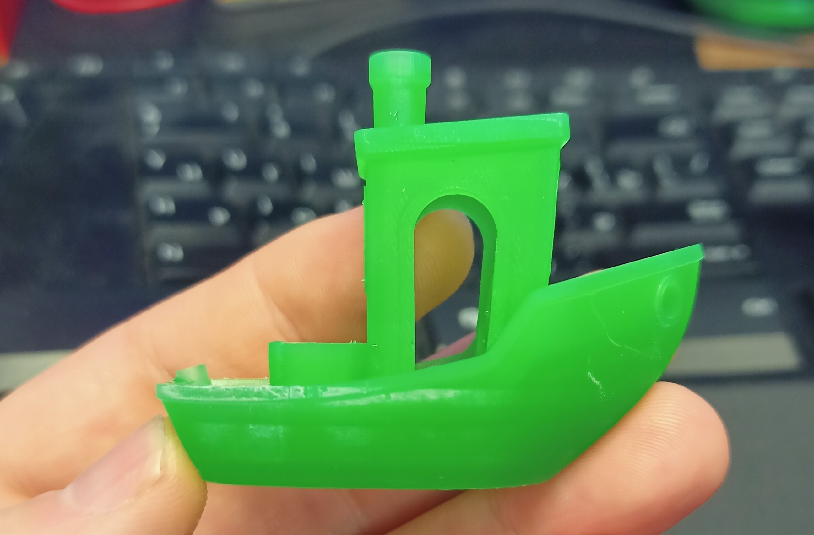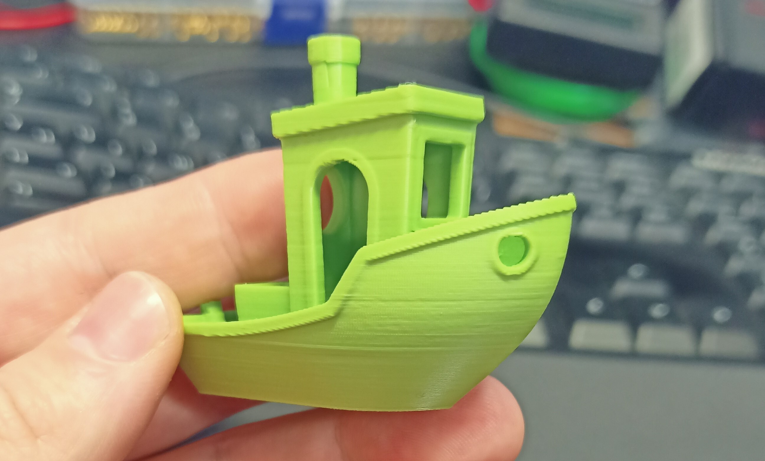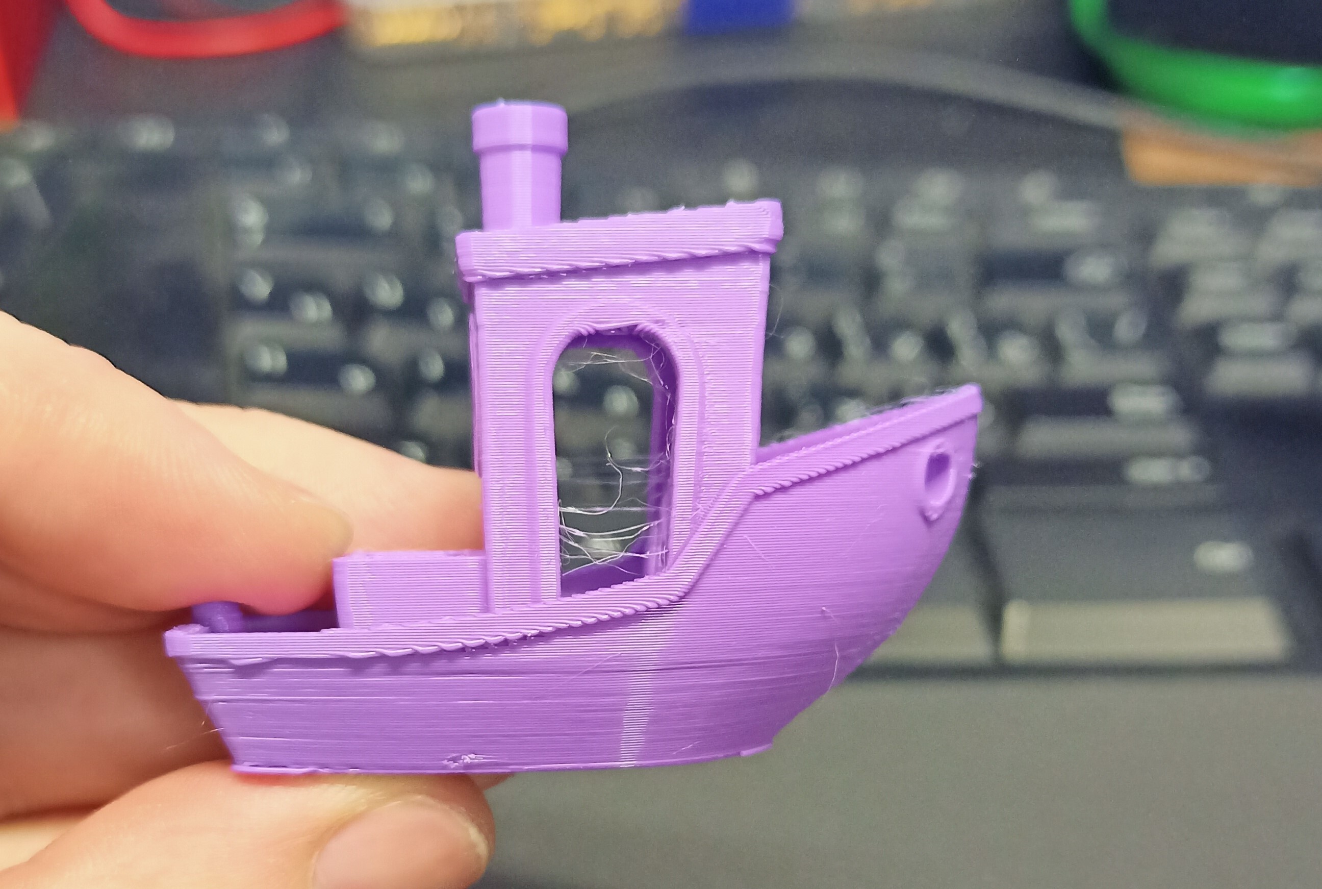 3DBenchy (похоже что зеленый и фиолетовый отсырели, обычно таких артефактов и волосни нет):