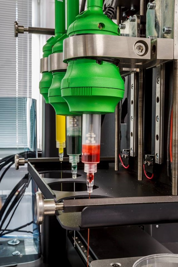 Его пять сопел будут подкачивать сфероиды и выдавливать гидрогель и биогель последовательными слоями для придания формы распечатываемой ткани.