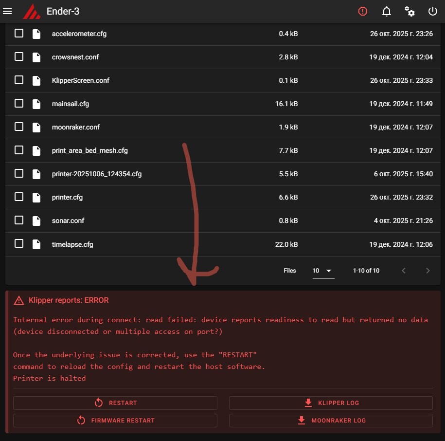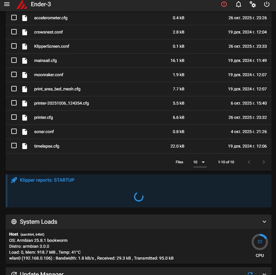 Далее вывел в консоль ssh запрос подключенных устройств, получил 2 адреса, один из которых адрес MCU, другой адрес ADXL, скопировал его и вставил. Можете увидеть на картинке. Теперь нужно перенести это в printer.cfg. Делал это двумя способами: вставкой этой строчки в printer.cfg - [include accelerometer.cfg] или copy&past. После этого принтер уходит в бесконечную загрузку, пишет "printer not ready", дисплей отключается, горит синим.