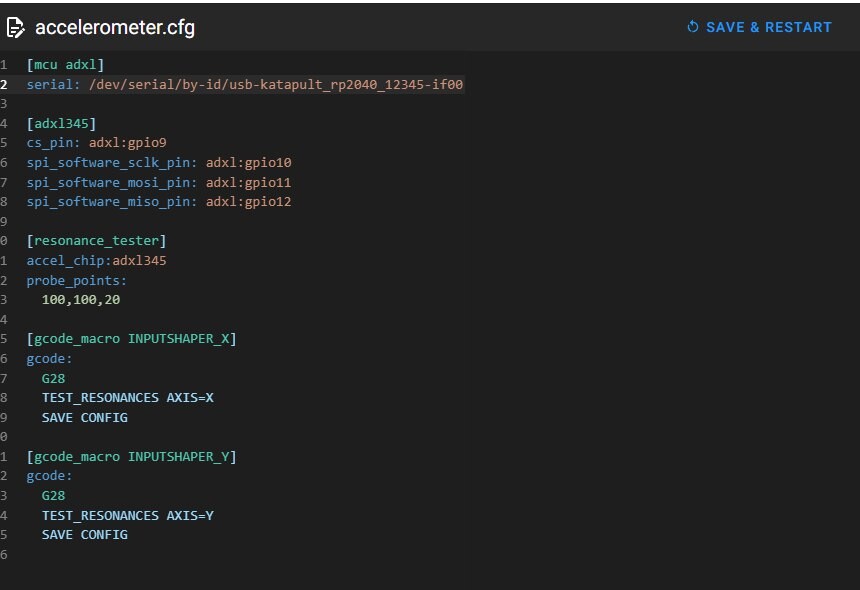 Калибрую Input Shaping с помощью датчика ADXL345 Type-C на Ender-3 Klipper. Создал файл accelerometer.cfg, добавил туда скрипт:
