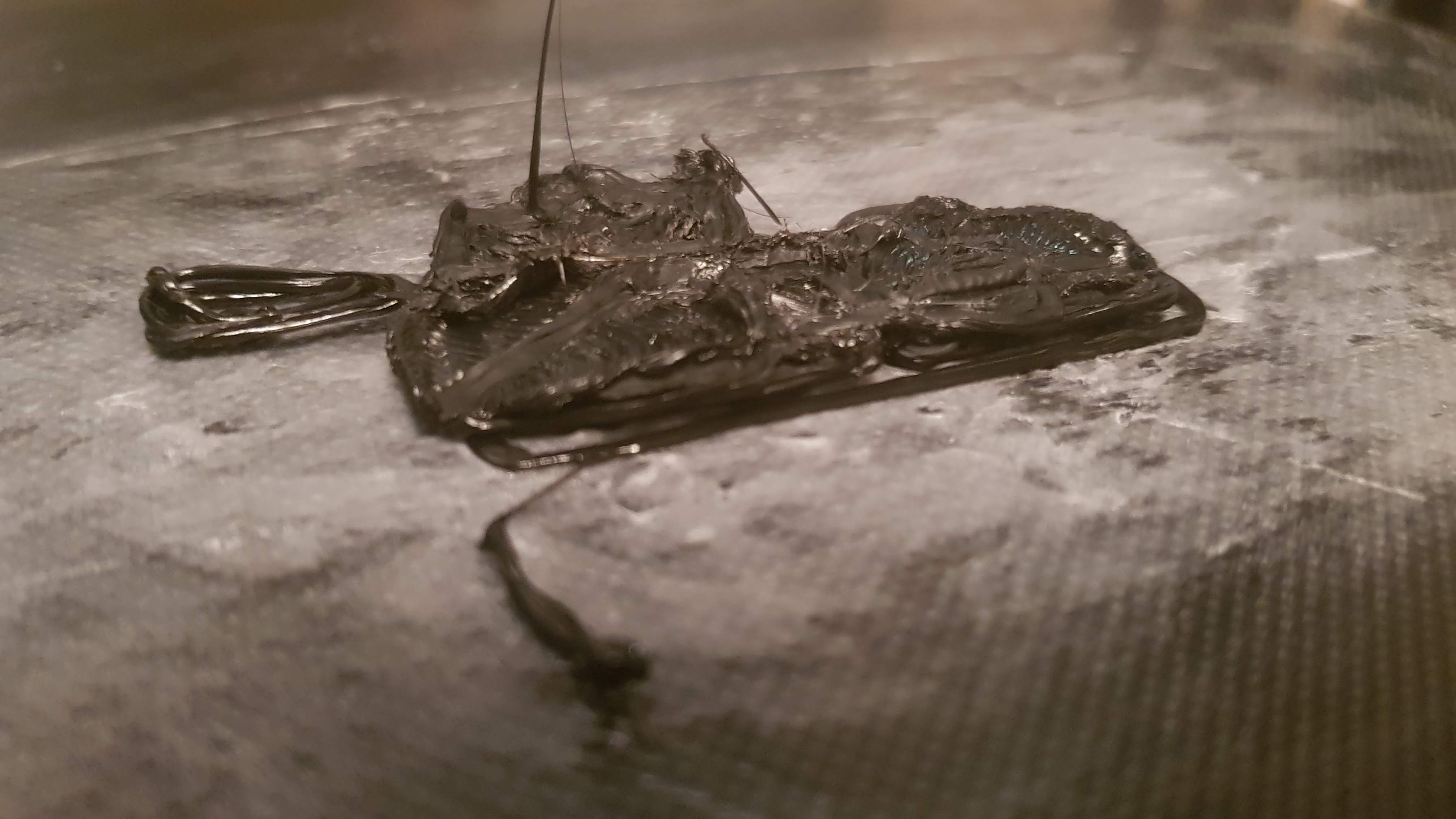 - После третьего слоя, (по оси Z вроде как 0,6 в координатах на дисплее) Головка экструдера начинает вгрызаться в пластик, и на слое 4м (по Z в этот момент 0,8) двигатель начинает щелкать, поскольку сильно упирается головка в отпечатанную часть изделия, и происходит смещение по осям.